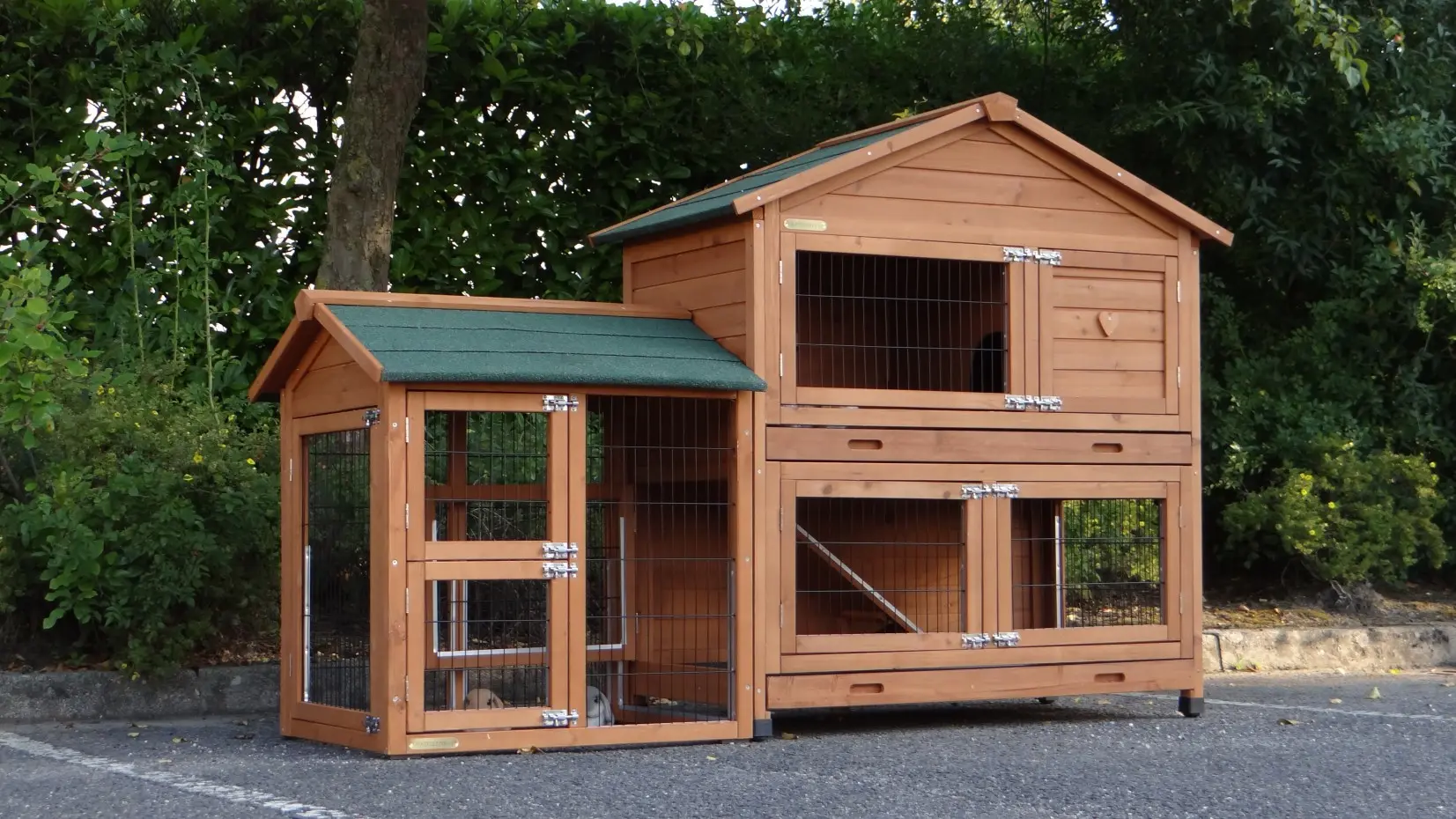 Konijnenhok Excellent Medium is uitgebreid met de ren Space Small. Het hok wordt geleverd in de kleur roodbruin. Konijnenhok Excellent Medium is een uniek en erg handig konijnenhok met 2 extra diepe uitschuifbare lades, overal (!) royale deuren en dit konijnenhok is voorzien van aluminium anti knaag strips op de meest knaaggevoelige randen in het hok. Maximale buitenwerkse afmetingen 200x67x132cm (bxdxh)