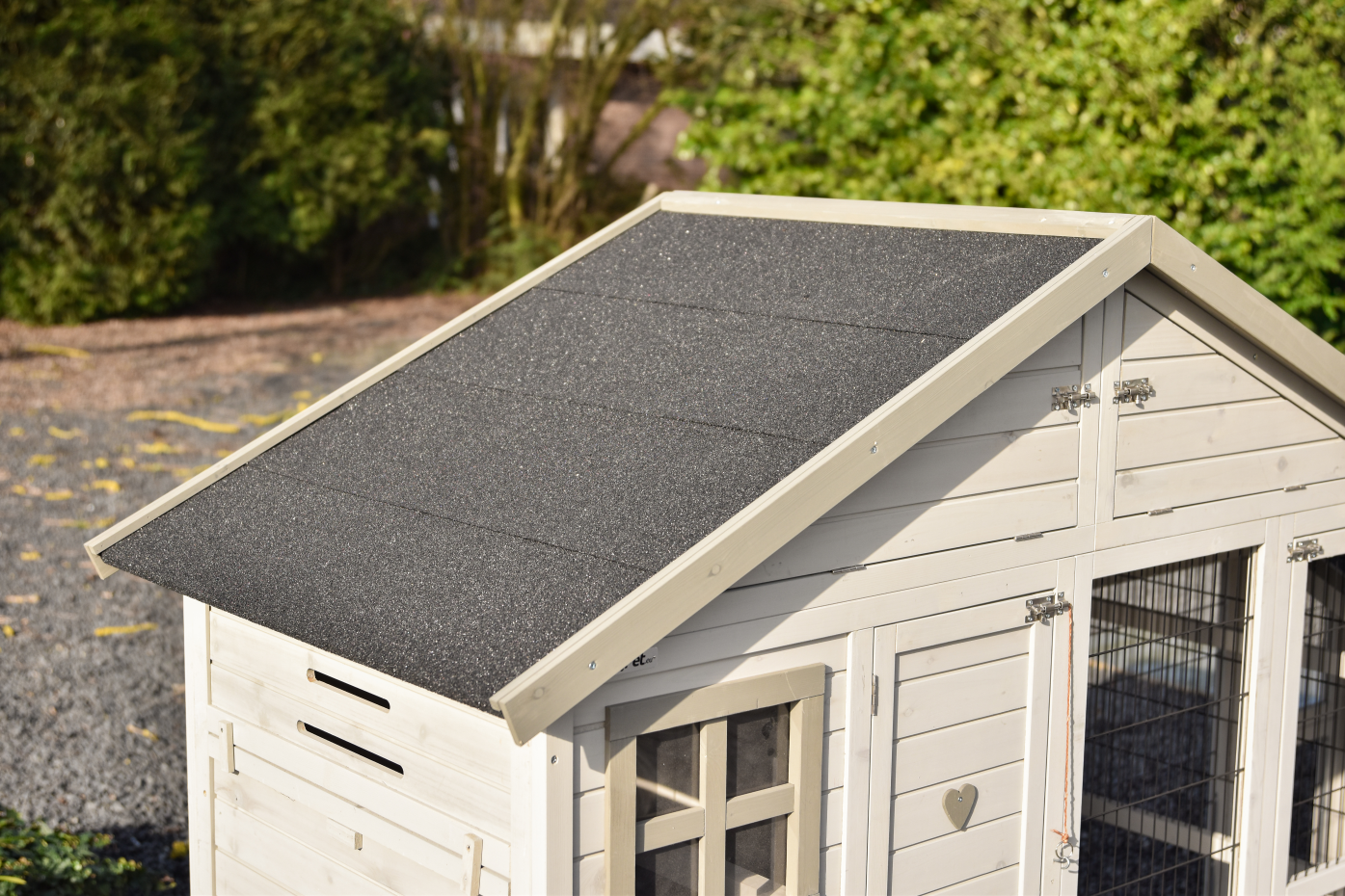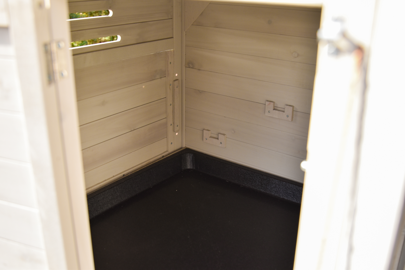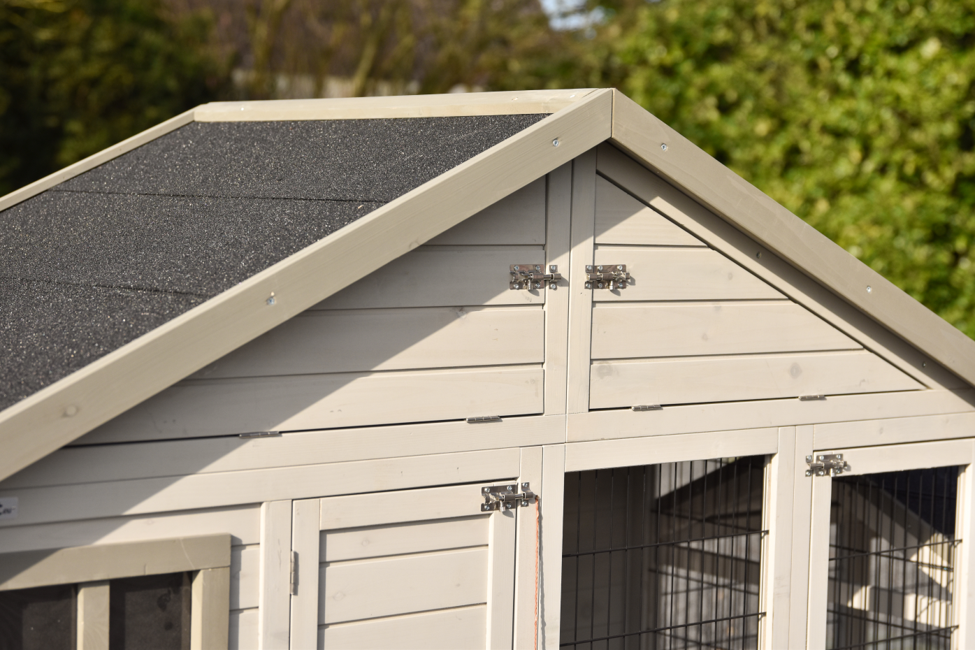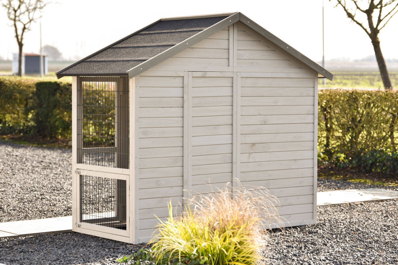 - Het hok heeft anti-knaagstrips op de meest gevoelige plekken, maar is niet volledig beschermd. Voor onbeschermde randen kunt u extra anti-knaagstrips mee bestellen.