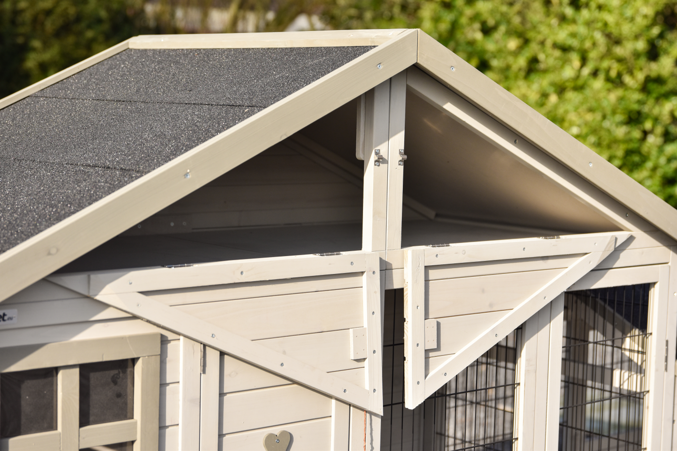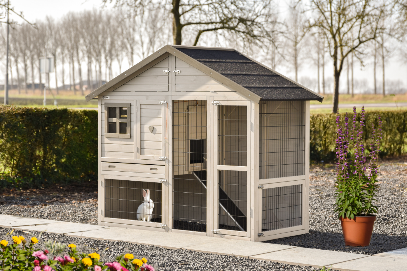 Het konijnenhok Holiday medium is een ruim en praktisch dierenverblijf in de kleur light-grey met meerdere deurtjes, waardoor voeren, schoonmaken en verzorgen eenvoudig blijft; dit middelste formaat uit de Holiday-serie biedt comfortabele leefruimte voor konijnen, beschikt over een handige opbergzolder voor bijvoorbeeld voer of accessoires en kan volledig worden uitgebreid met diverse uitlooprennen, zodat het verblijf kan meegroeien en aangepast kan worden aan de beschikbare ruimte in de tuin.