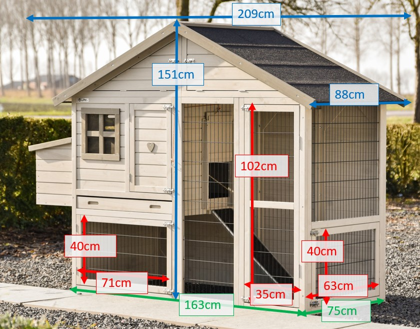 | Buitenwerkse afmetingen incl. dak en nestkast (BxDxH) | 209x88x151cm |