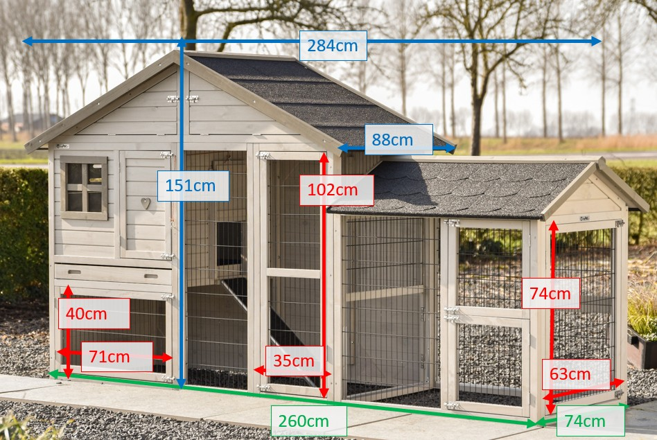 | Buitenwerkse afmetingen incl. dak en nestkast (BxDxH) | 284x88x151cm |