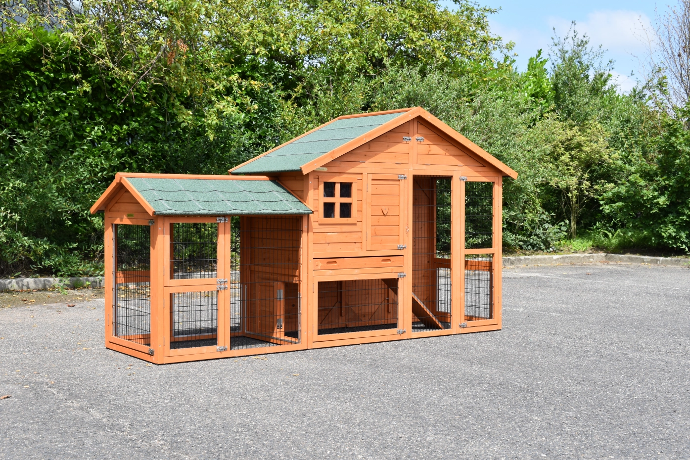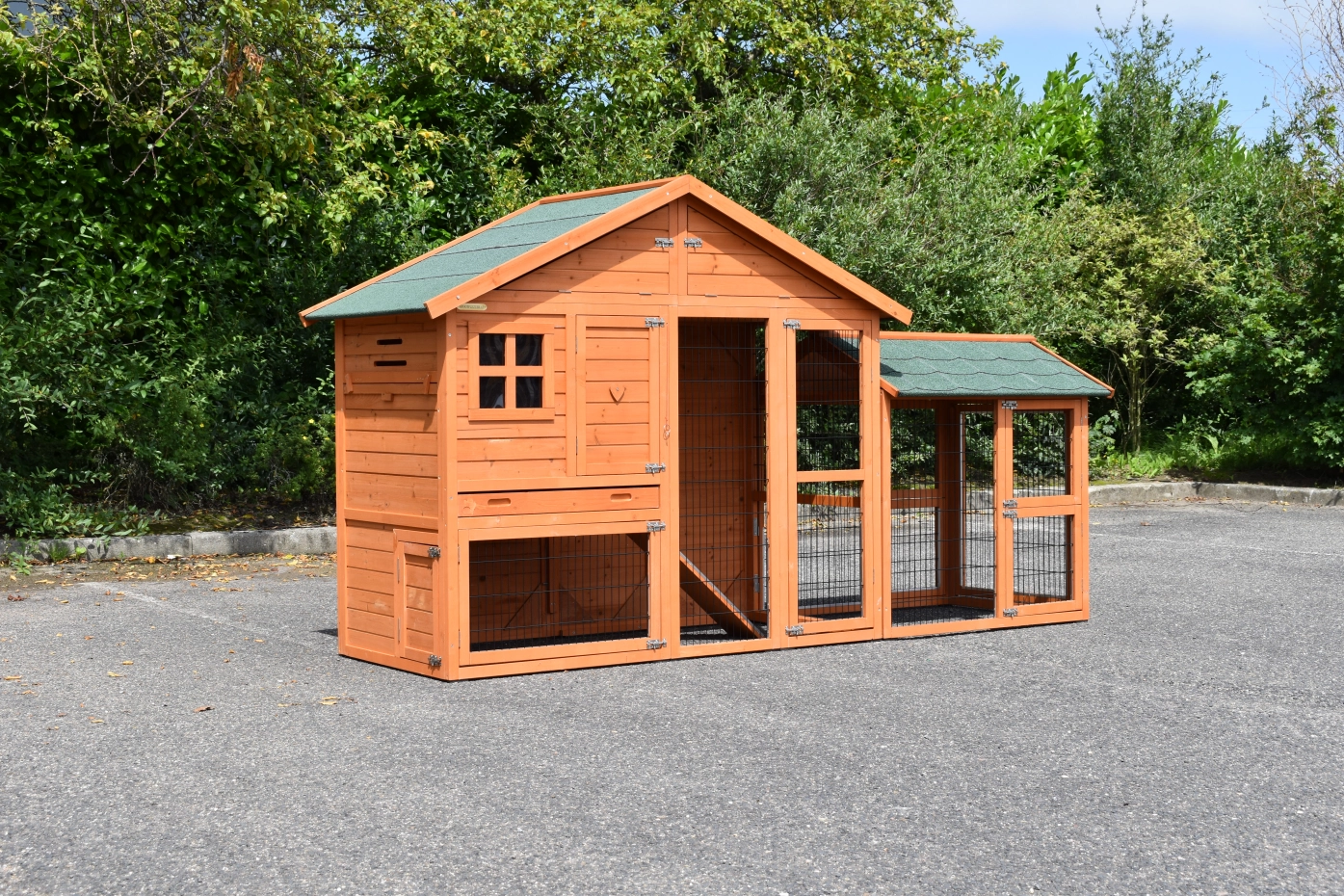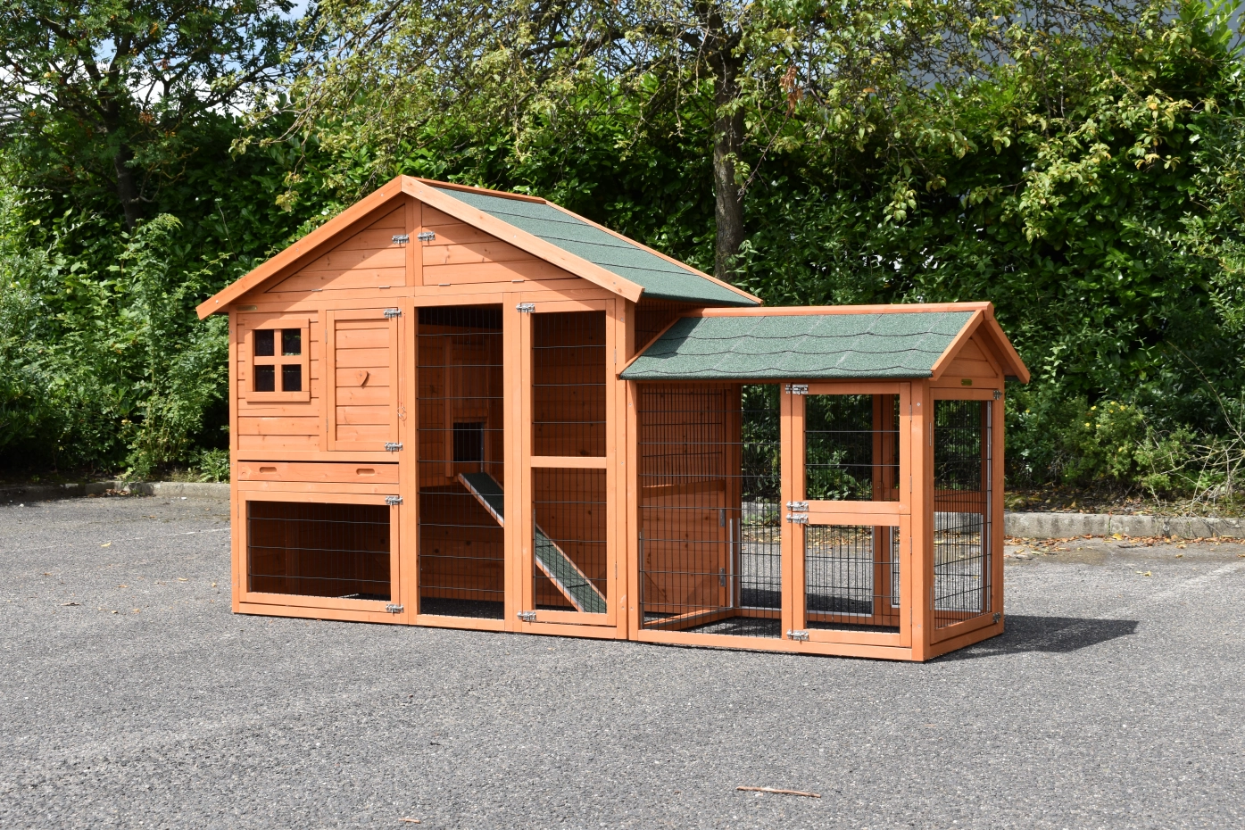 Konijnenhok Holiday Medium Antiknaag met uitloopren. Dierenverblijf Holiday Medium met uitloopren is een zeer praktisch en mooi konijnenhok met nachthok en royale ren. Konijnenhok Holiday Medium met uitloopren is geschikt voor het huisvesten van grote konijnen, zoals franse hangoren, vlaamse reuzen, andere grote rassen of een groepje konijnen. Afmetingen konijnenhok met ren 284x88x151cm (buitenwerks)
