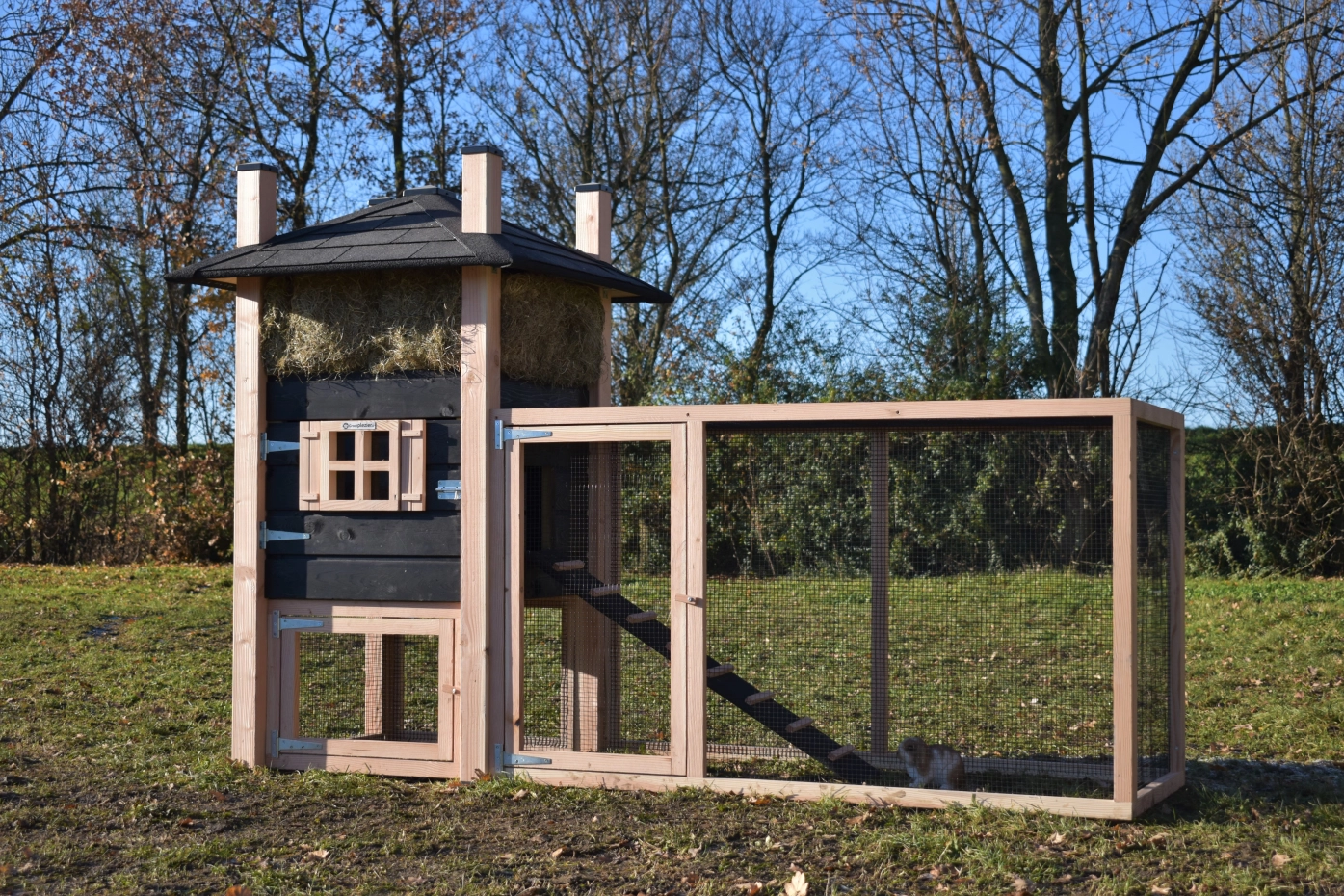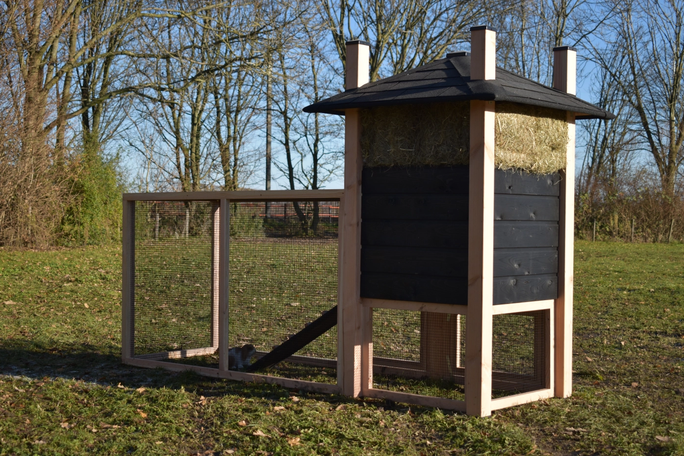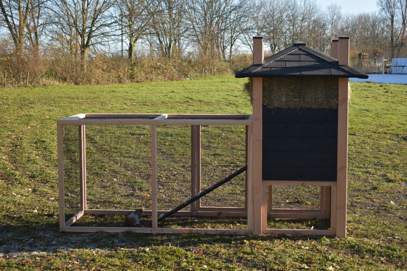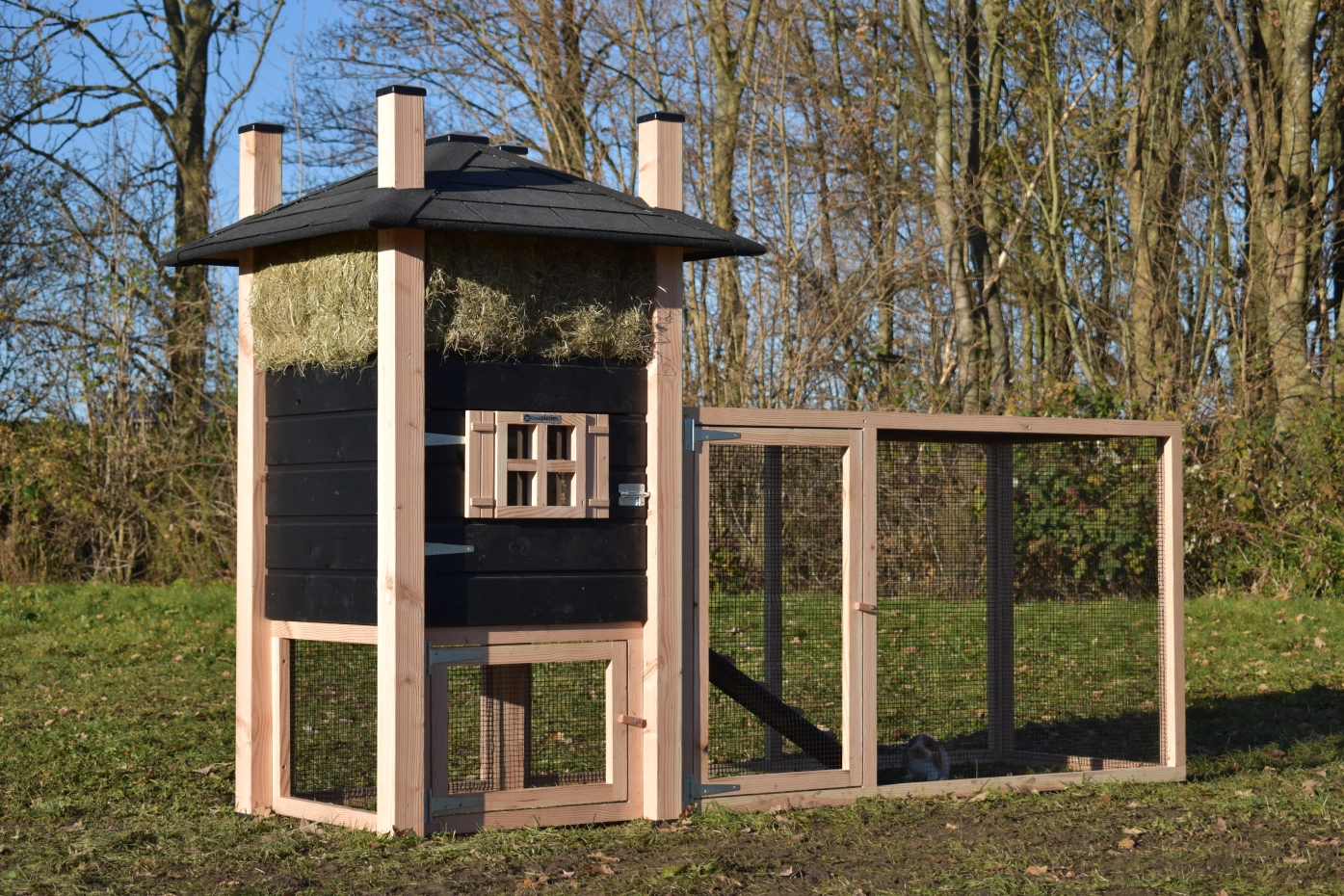 Konijnenhok hooiberg Rosa. Uitgevoerd in Douglas/zwart geeft dit hok een schitterender uitstraling! Handig hok met een ruime ren. Een waar paleisje voor uw kippetjes! De ruime deuren in nachthok en ren geeft u een goede toegang voor schoonmaken etc. Doordat het dak voorzien is van dakshingles geeft dit uw hok een karakteristieke stijl! Dit hok is standaard voorzien van hooi. Het hout heeft een lange levensduur en de rabat is zorgvuldig behandeld met zwarte beits. De ruime ren heeft zwart gaas dit geeft u een goed zicht op uw dieren. Doordat de ren onder het nachthok door loopt hebben uw konijnen een plakje om te schuilen tegen de regen.