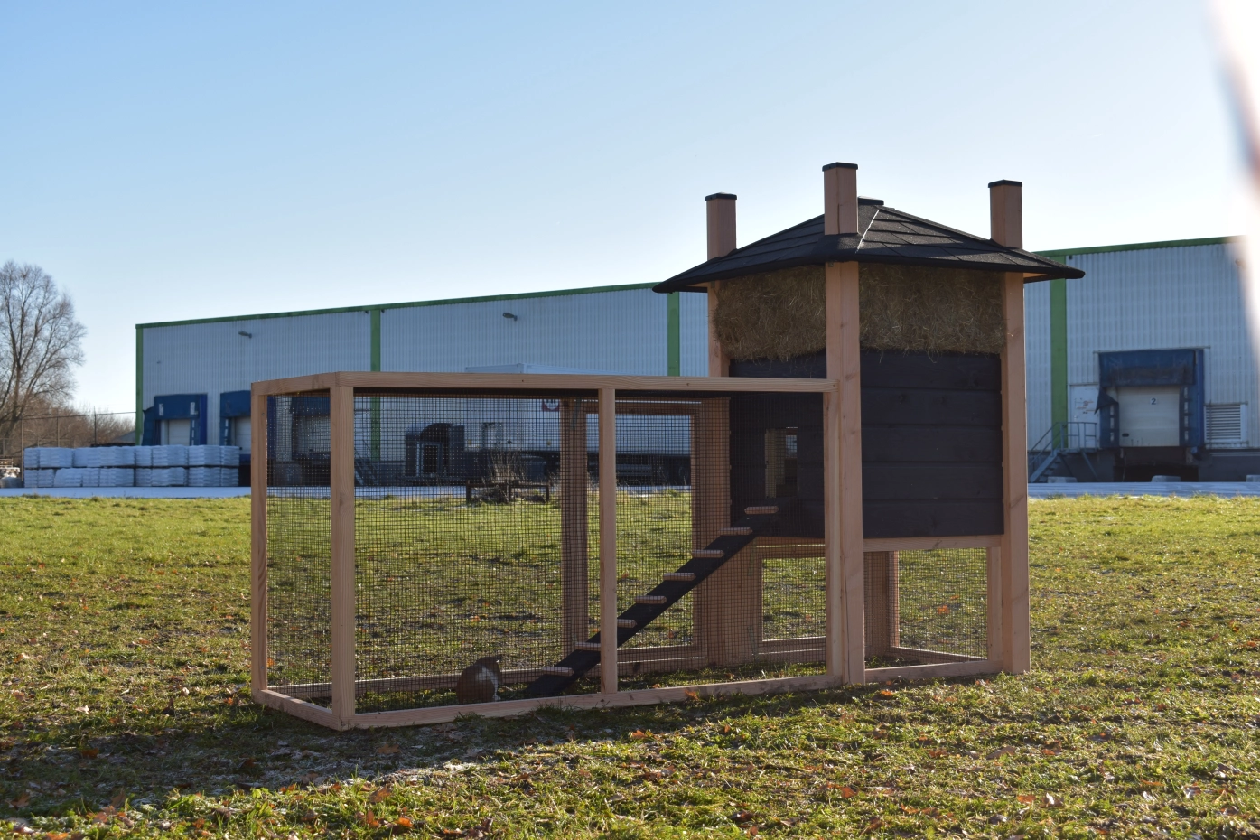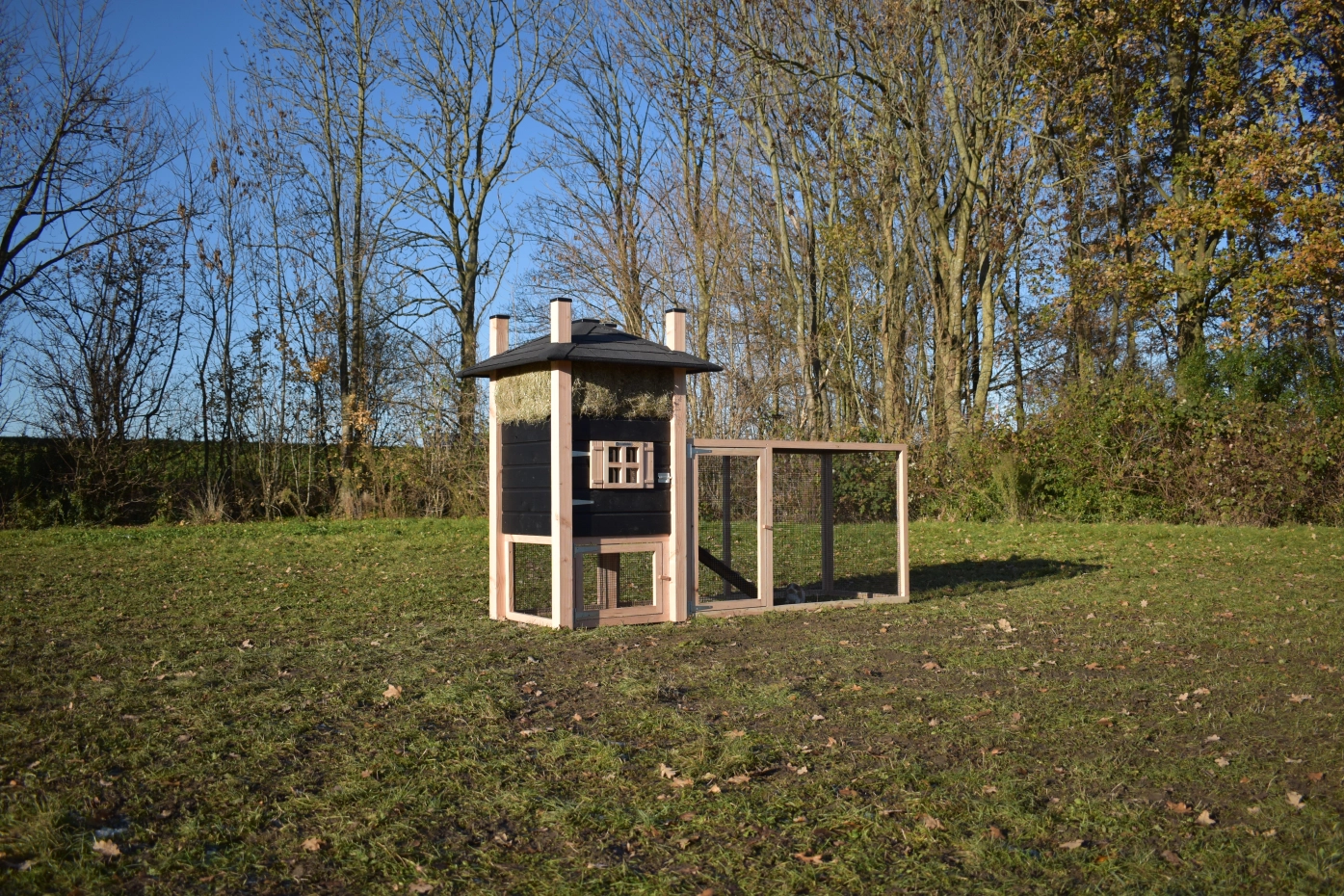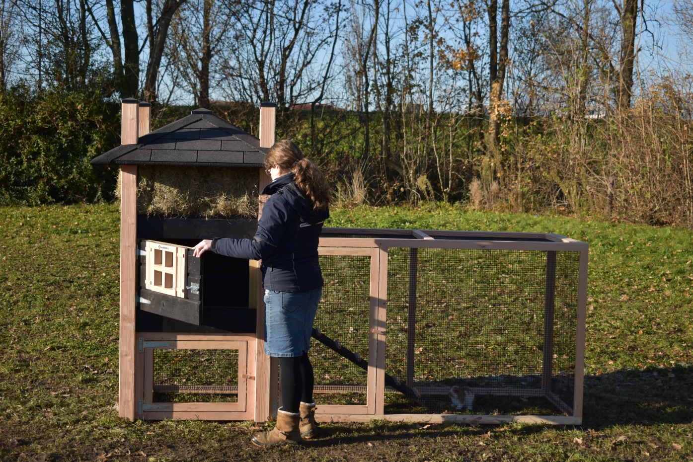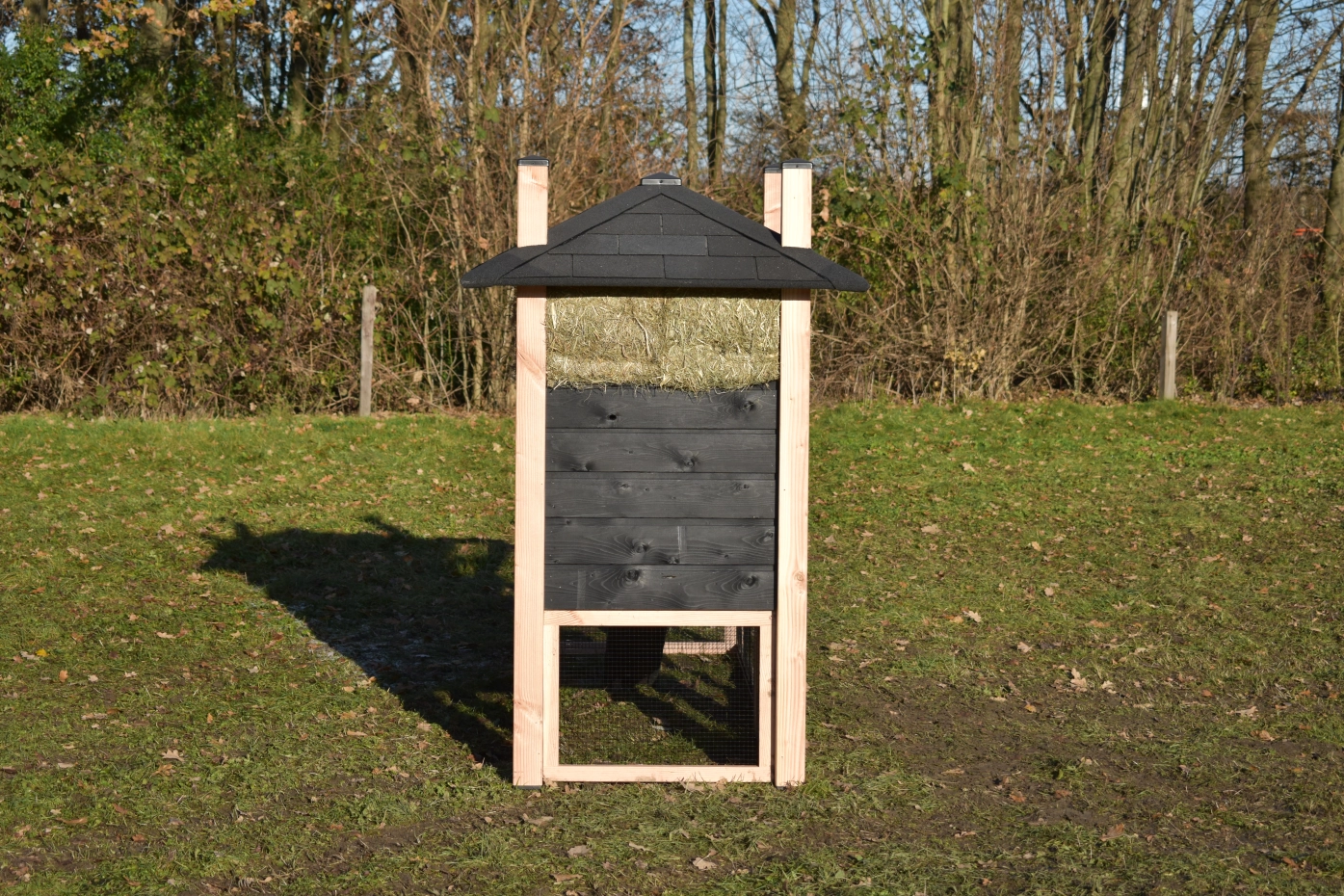 Konijnenhok hooiberg Rosa. Uitgevoerd in Douglas/zwart geeft dit hok een schitterender uitstraling! Handig hok met een ruime ren. Een waar paleisje voor uw kippetjes! De ruime deuren in nachthok en ren geeft u een goede toegang voor schoonmaken etc. Doordat het dak voorzien is van dakshingles geeft dit uw hok een karakteristieke stijl! Dit hok is standaard voorzien van hooi. Het hout heeft een lange levensduur en de rabat is zorgvuldig behandeld met zwarte beits. De ruime ren heeft zwart gaas dit geeft u een goed zicht op uw dieren. Doordat de ren onder het nachthok door loopt hebben uw konijnen een plakje om te schuilen tegen de regen.