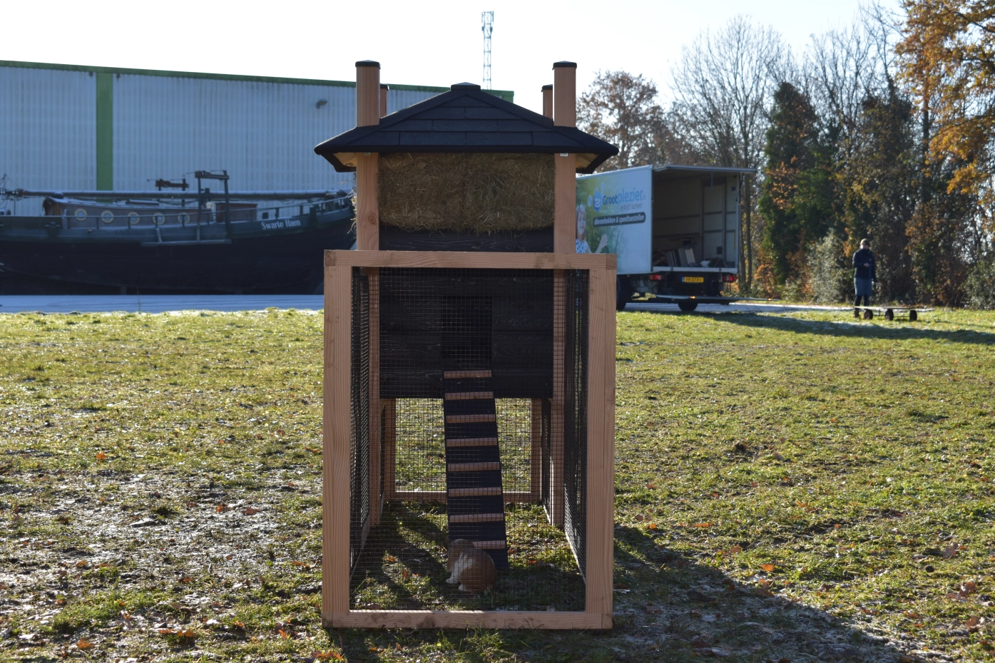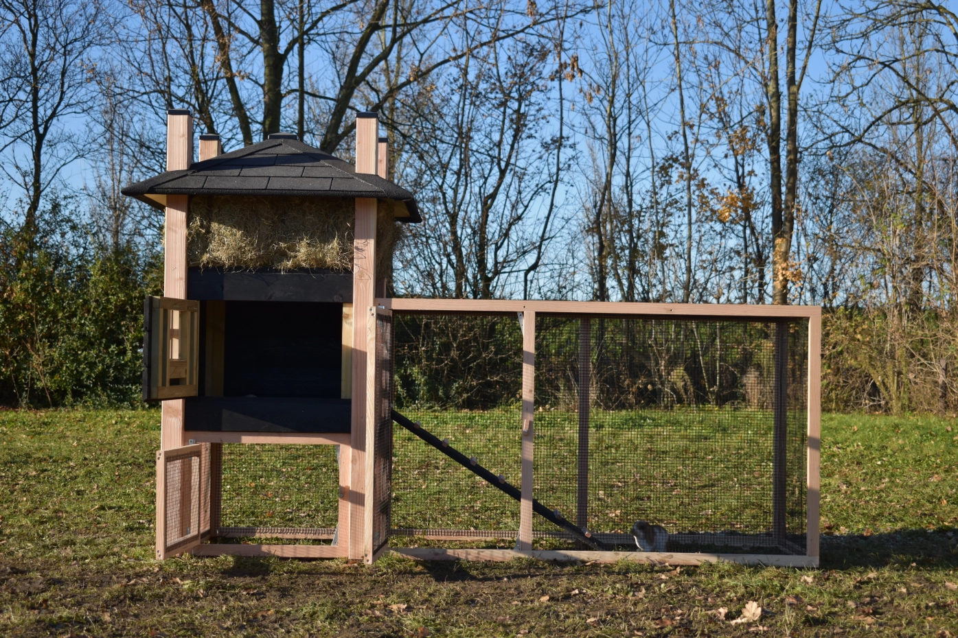 - Dit dierenverblijf wordt gemaakt van een geรฏmpregneerd grenen frame. De afwerking is met Douglashout en zwarte potdeksel planken. Dat maakt het hok onderhoudsvrij en zorgt voor een lange levensduur