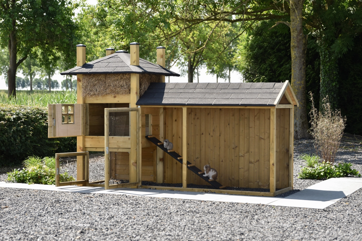Konijnenhok hooiberg Rosa met ren is een mooi landelijk hok. Het sfeervolle ontwerp maakt je tuin een stuk gezelliger en geeft u een gevoel van landelijk wonen. Aan het hok zit een ruime ren met puntdak en een ruime deuropening. In het konijnenhok zit een brede deur voor een gemakkelijke schoonmaak. De achterkant van de ren is dicht zodat de konijnen lekker beschut kunnen rusten.