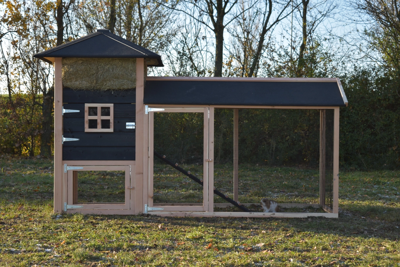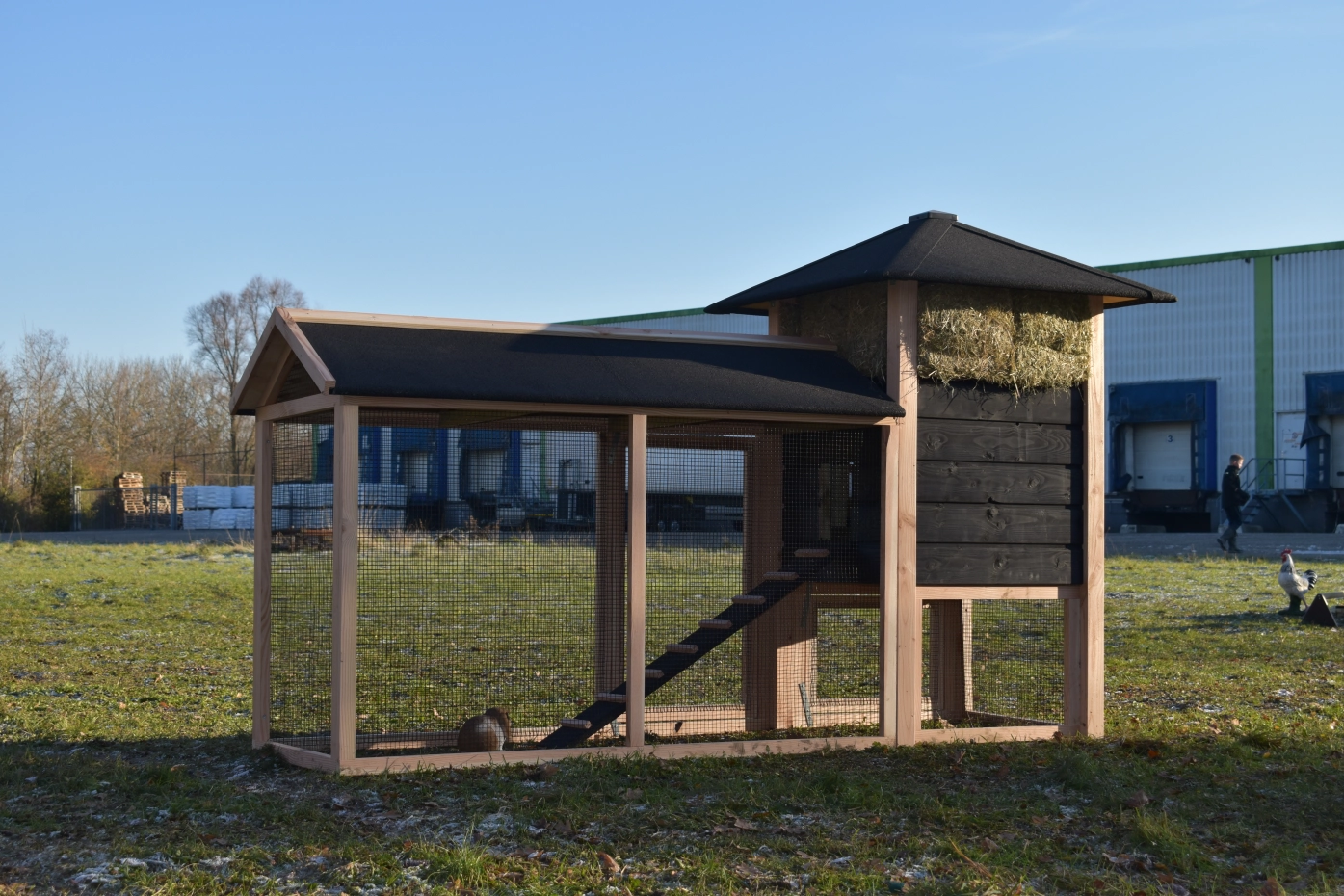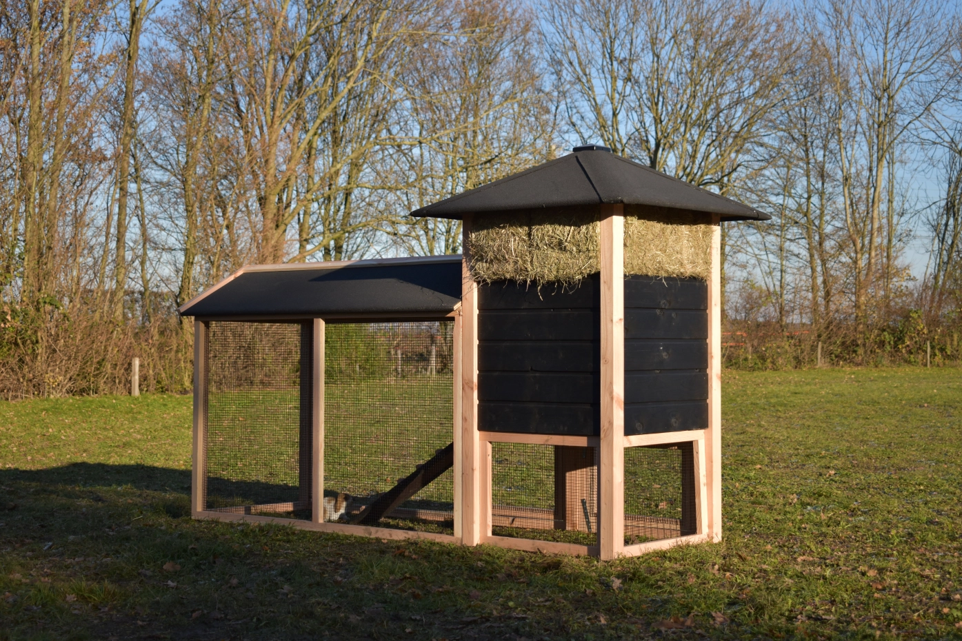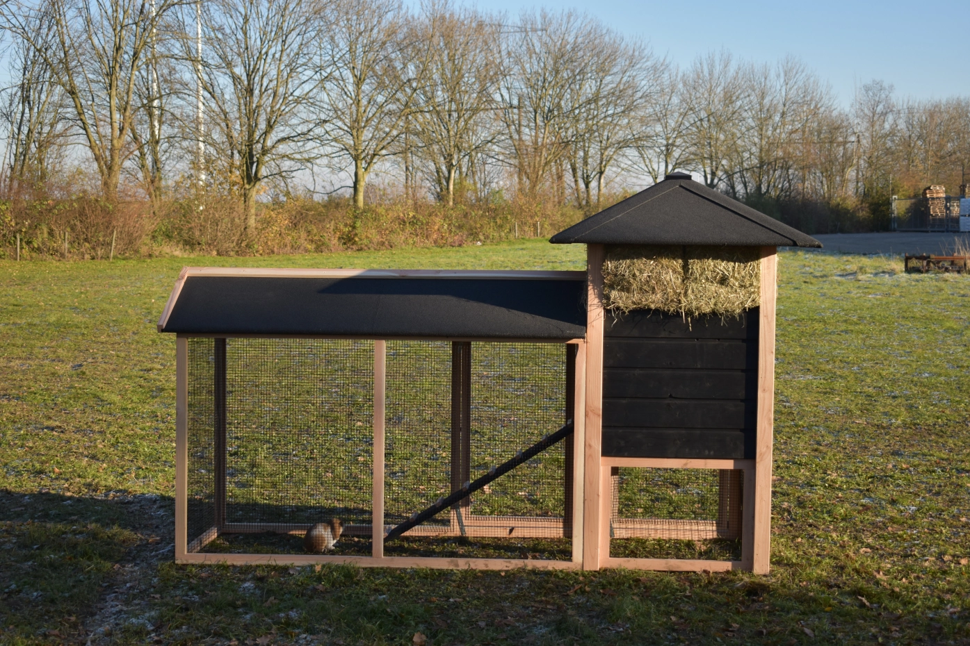 Met deze hooiberg Rosanne met aanbouwren koopt u een pracht hok met praktische eigenschappen. De palen zijn van Douglas hout, dit is onderhoudsvrij en goed bestand tegen regen en wind! Doordat de palen niet door het dak steken is het hok wat rustiger qua uitstraling. Toch hebt u voor relatief weinig geld een degelijk en mooi hok waar u met gemak 3-4 grote kippen in kunt houden. De deuren zijn zo breed mogelijk gemaakt dus u hebt genoeg ruimte om schoon te maken enz. De ren heeft zwart gaas en dit maakt dat u er goed doorheen kunt kijken. Als u hooi mee bestelt, is dit een ideaal hok met een prachtig design!