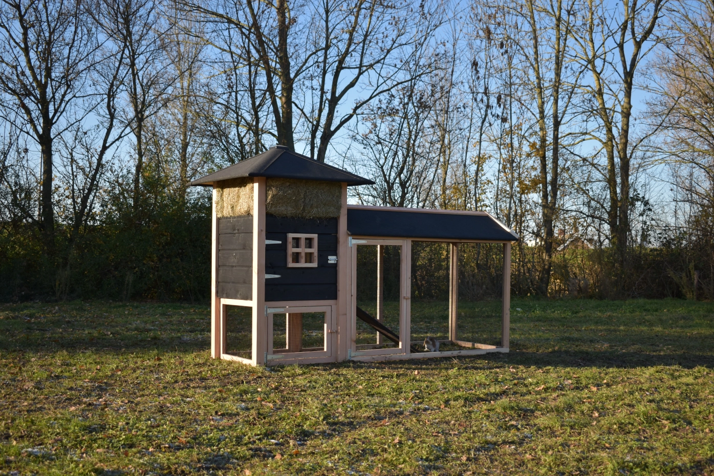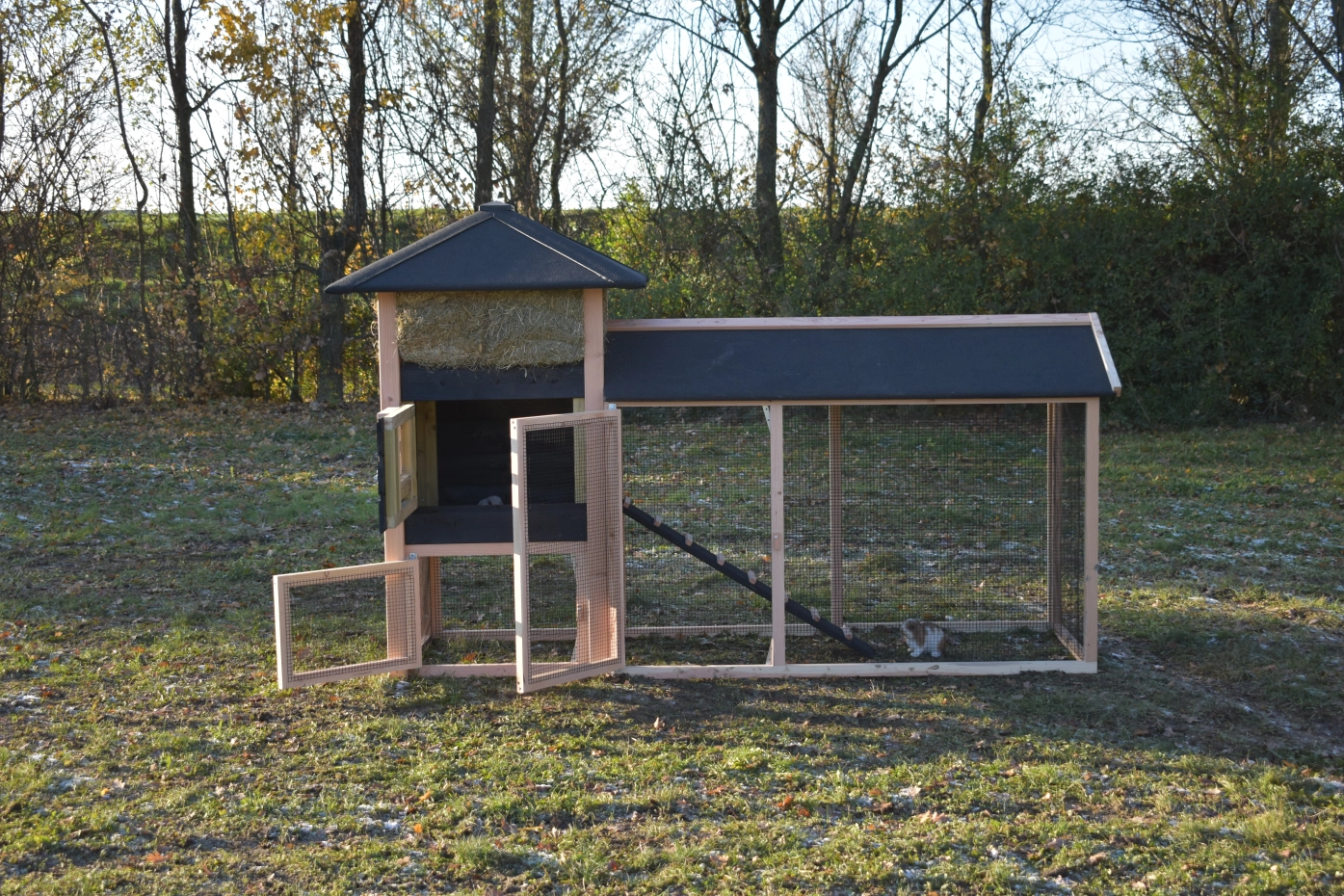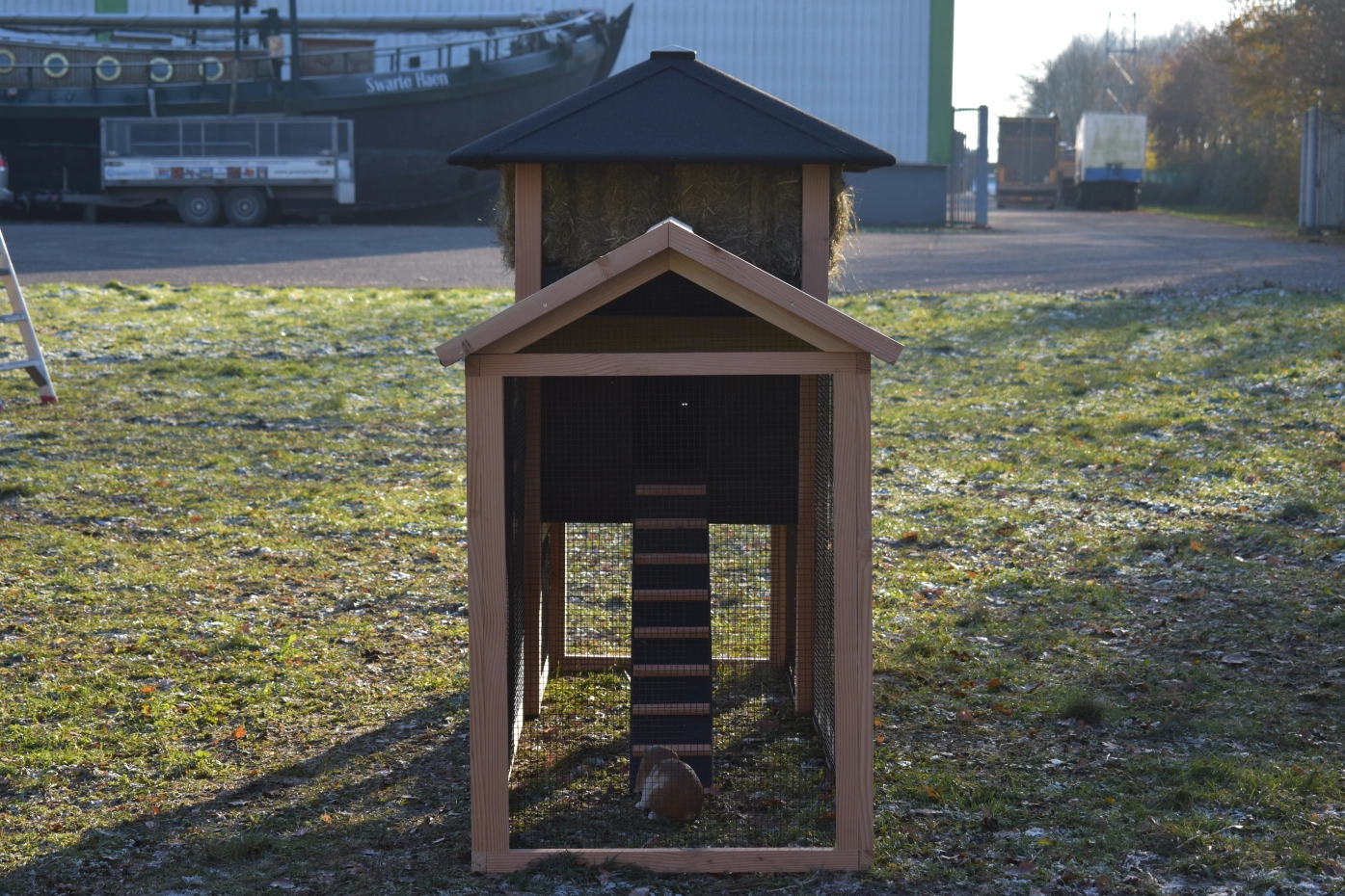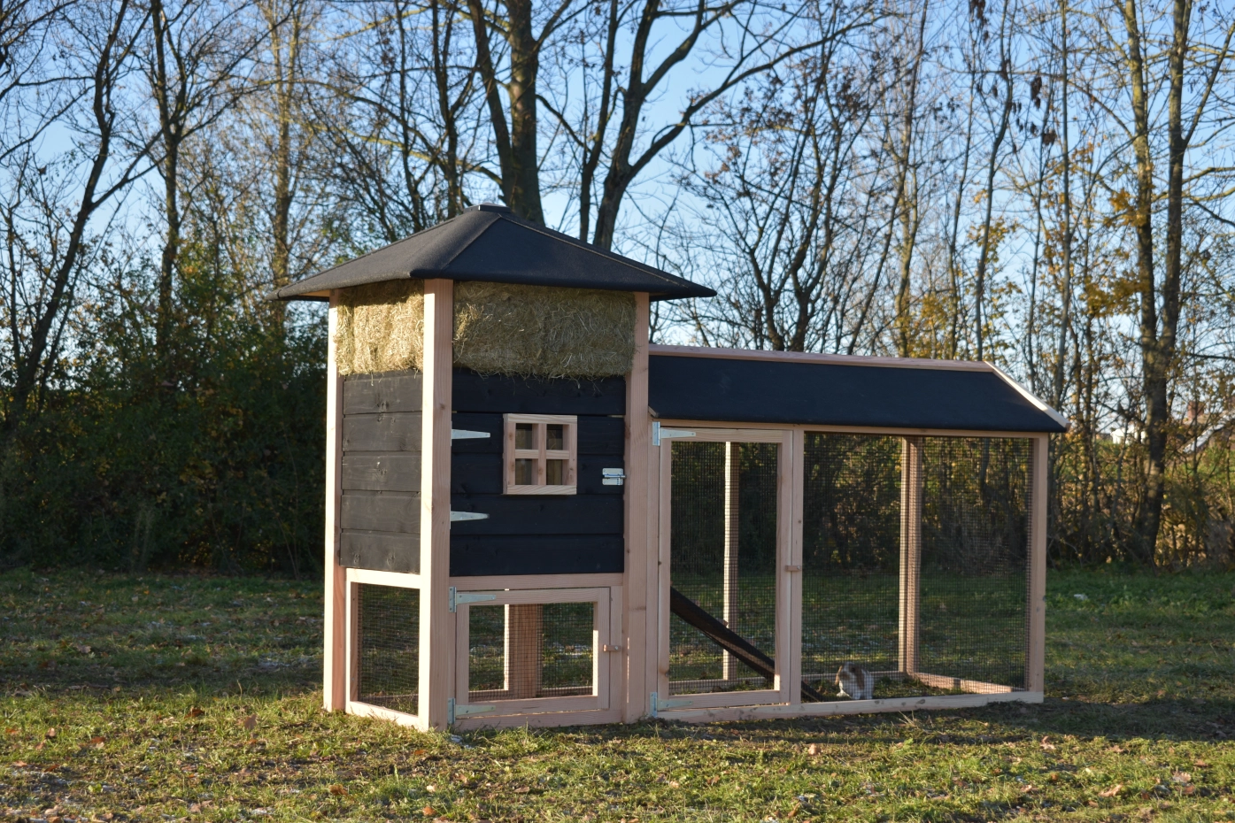 Met deze hooiberg Rosanne met aanbouwren koopt u een pracht hok met praktische eigenschappen. De palen zijn van Douglas hout, dit is onderhoudsvrij en goed bestand tegen regen en wind! Doordat de palen niet door het dak steken is het hok wat rustiger qua uitstraling. Toch hebt u voor relatief weinig geld een degelijk en mooi hok waar u met gemak 3-4 grote kippen in kunt houden. De deuren zijn zo breed mogelijk gemaakt dus u hebt genoeg ruimte om schoon te maken enz. De ren heeft zwart gaas en dit maakt dat u er goed doorheen kunt kijken. Als u hooi mee bestelt, is dit een ideaal hok met een prachtig design!