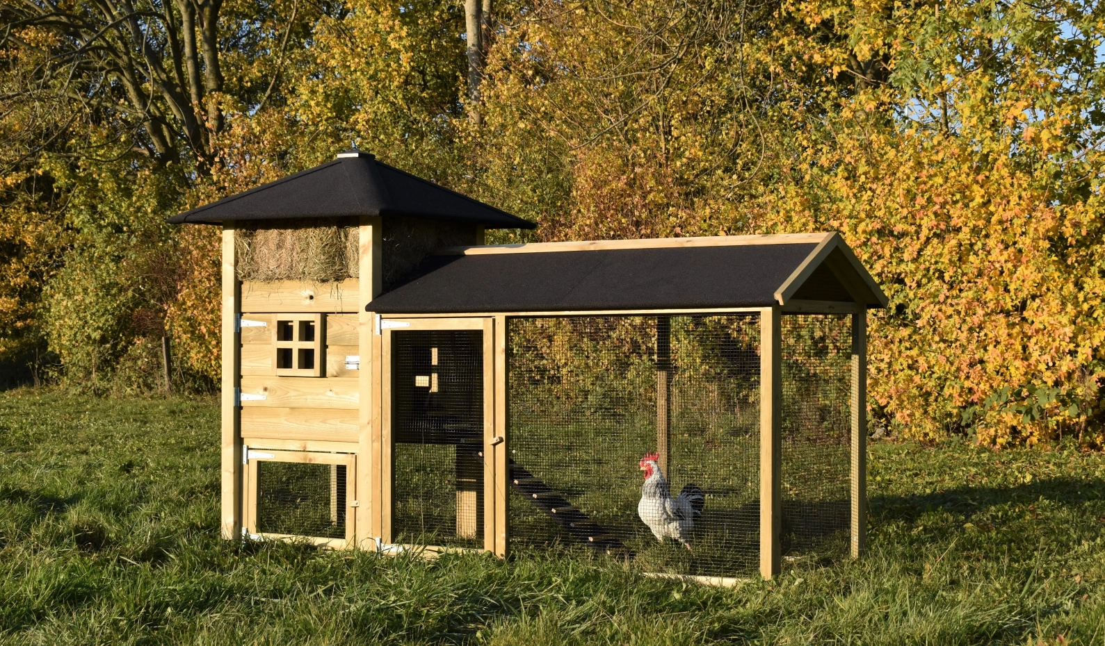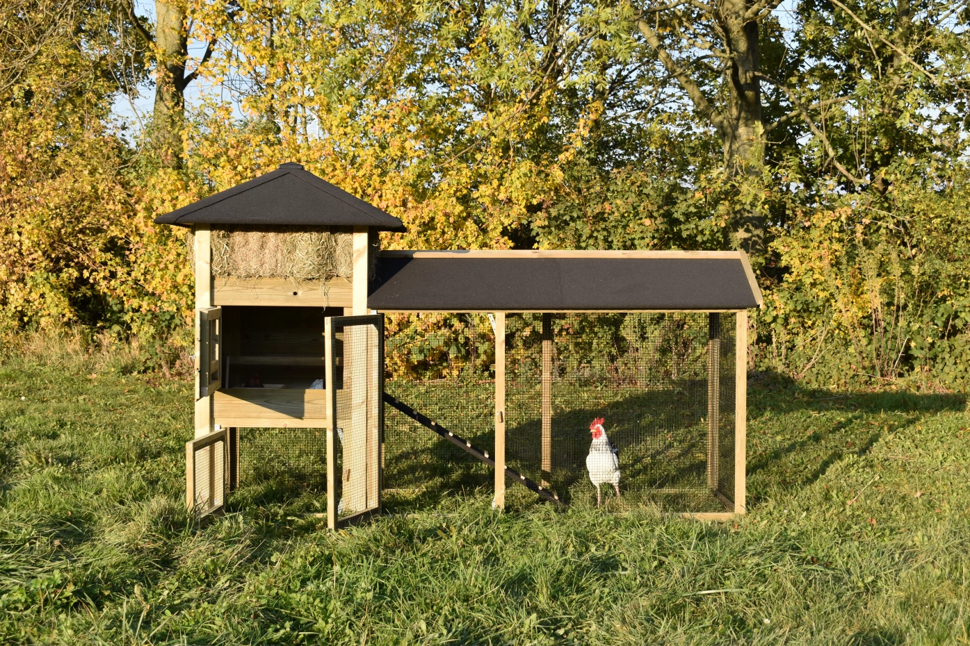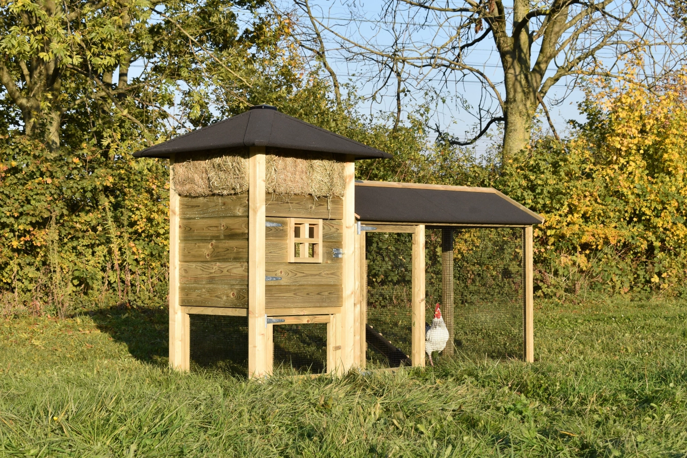 Met deze hooiberg Rosanne met aanbouwren koopt u een mooi hok met praktische eigenschappen. Het hout is geïmpregneerd vuren, dit is onderhoudsvrij en goed bestand tegen regen en wind! Doordat de palen niet door het dak steken is het hok wat rustiger qua uitstraling. De deuren zijn zo breed mogelijk gemaakt dus u hebt genoeg ruimte om schoon te maken enz. De ren heeft zwart gaas en dit maakt dat u er goed doorheen kunt kijken. Doordat de ren overdekt is kunnen de konijnen ook met regenachtig weer lekker buiten lopen. Om het plaatje echt af te maken, kunt u hooi meebestellen!