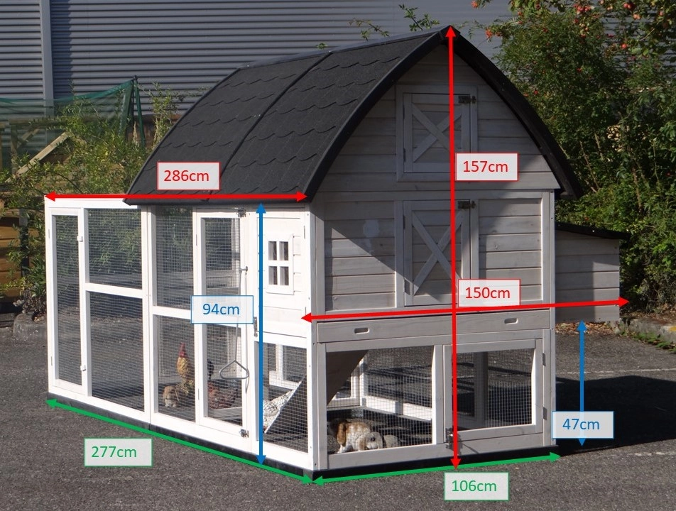 Buitenwerkse afmetingen incl. dak en nestkast (BxDxH) 286x150x157cm