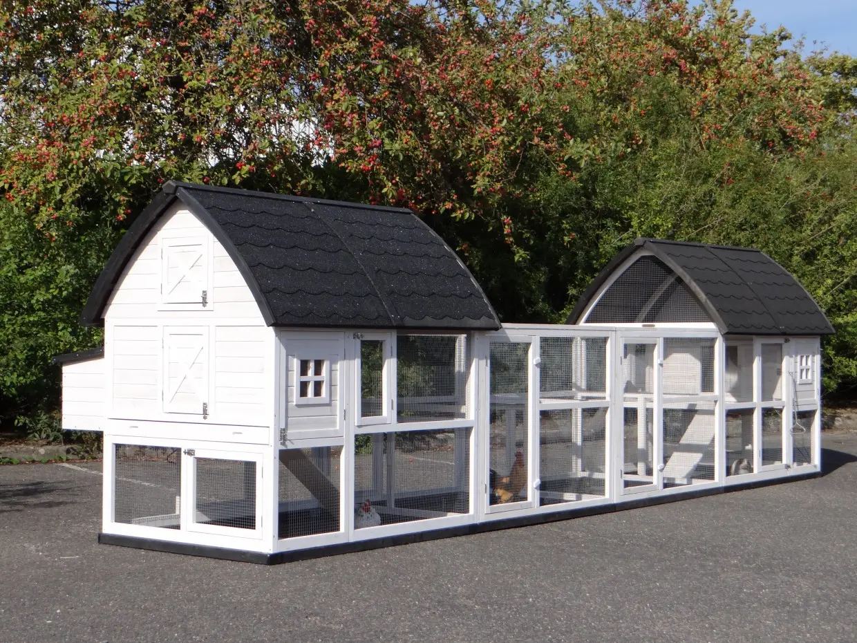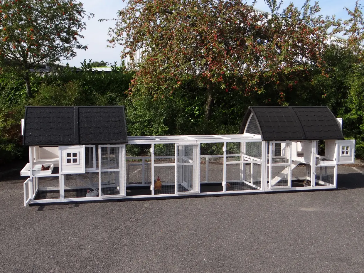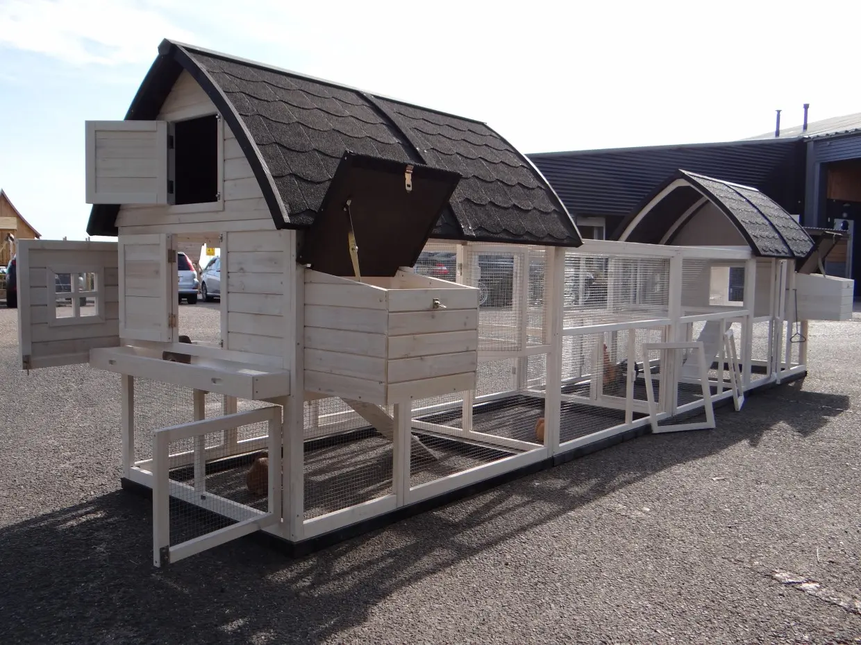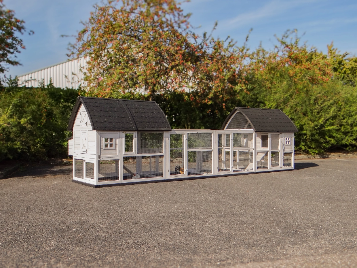 Met de combinatie van 2 Kathedraal Large konijnenhokken, 2 aanbouwrennen en funderingssets bieden wij alles voor comfortabel onderdak voor uw konijnen en kippen. Dit ruime houten hok heeft een dak met dakleer, een opbergzolder, een loopplank, een metalen schuiflade en dubbele sloten op de deuren. Uw dieren zullen zich hier veilig en tevreden voelen.