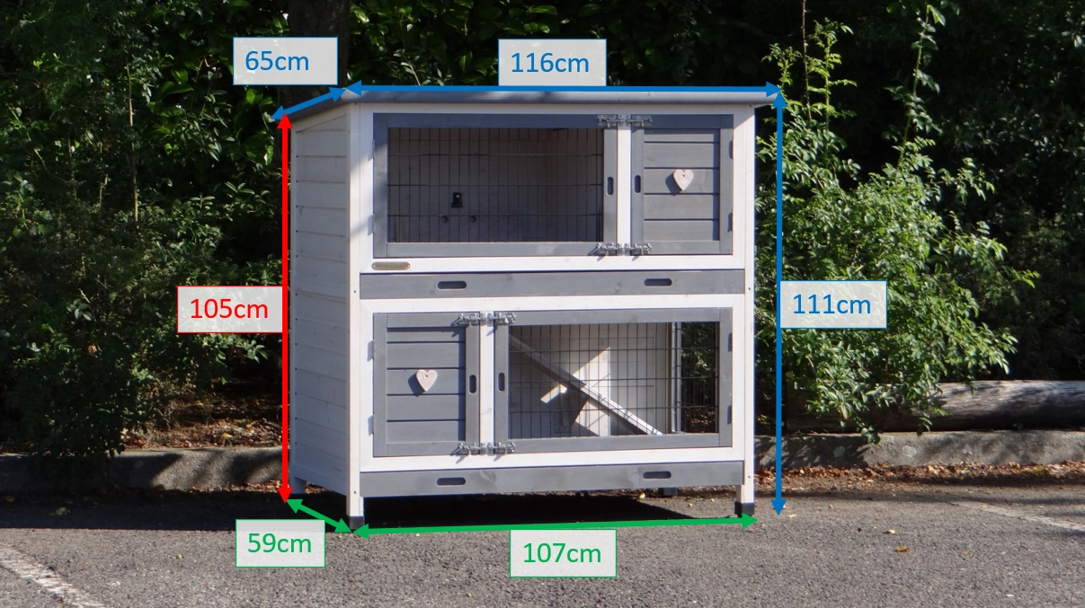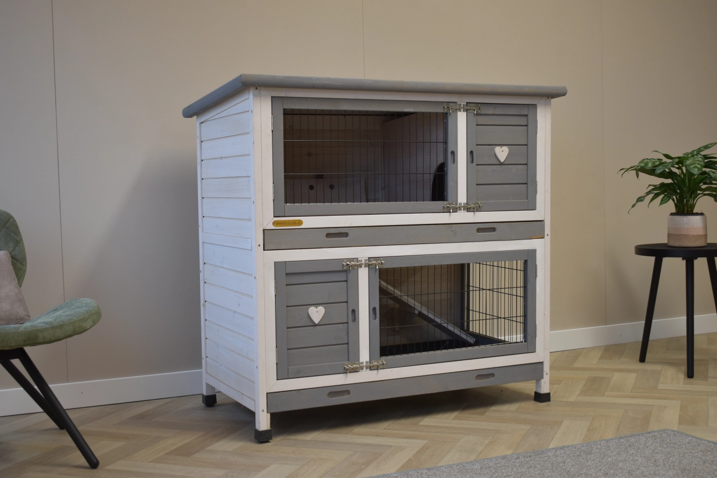 Konijnenhok Kim is een handig konijnenhok met 2 verdiepingen. De bovenverdieping van dit hok is af te sluiten. Het konijnenhok heeft 2 uitschuifbare kunststof lades, royale deuren en een handig scharnierdak. Konijnenhok Kim is voorzien van aluminium strips op de meest gevoelige plekjes, waardoor het voor konijnen lastig wordt om aan het hout te knabbelen. Het konijnenhok is voorzien van verstelbare, kunststof poten, zodat het konijnenhok altijd stabiel kan worden neergezet. De maximale buitenwerkse afmetingen van konijnenhok Kim zijn 116x65x111cm (BxDxH).