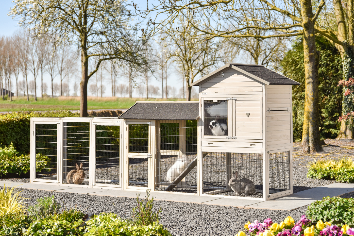 Een ruim en praktisch konijnenhok waarin uw konijnen zich direct thuis voelen. Het royale nachthok zorgt voor comfort en rust, terwijl de grote deuren het onderhoud eenvoudig maken. Het hok is voorzien van twee aanbouwrennen: één met een dakleer dak en één met een traliedak, zodat uw konijnen zowel beschut als in de buitenlucht kunnen verblijven. De ren met traliedak kan op verschillende manieren worden opgesteld. Dankzij de rubberen poten is het hok beschermd tegen optrekkend vocht. Bovendien is het konijnenhok Prestige Large eenvoudig uit te breiden met extra aanbouwrennen voor nog meer ruimte