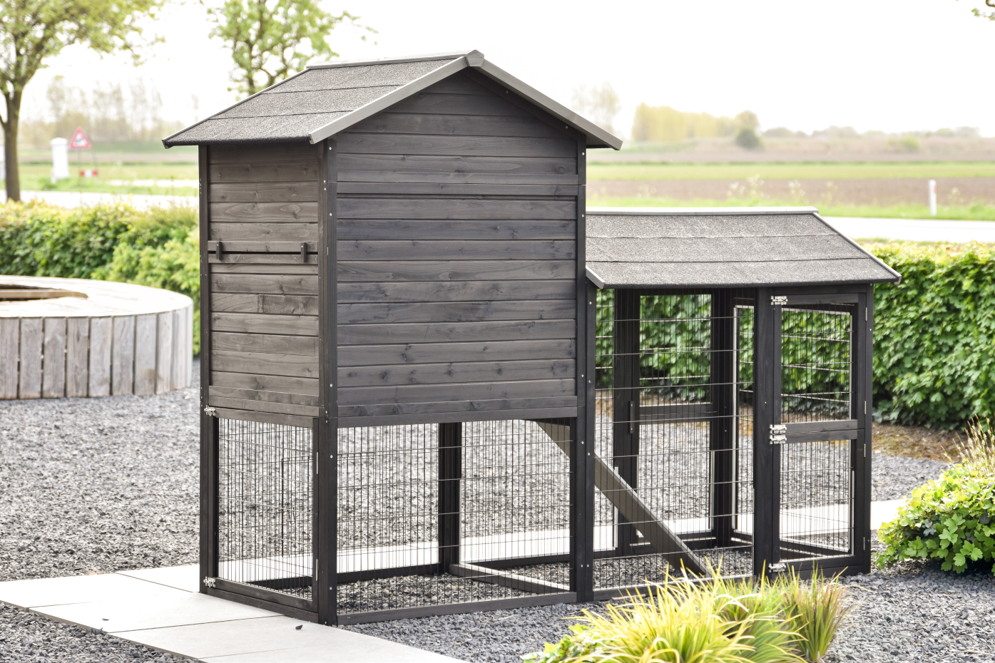 - Wanneer het hok niet op een beschutte plaats staat, dan adviseren wij om het te verankeren