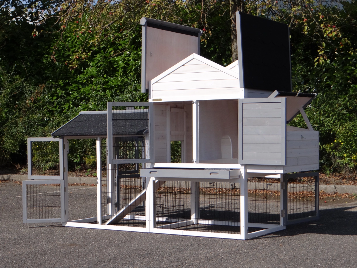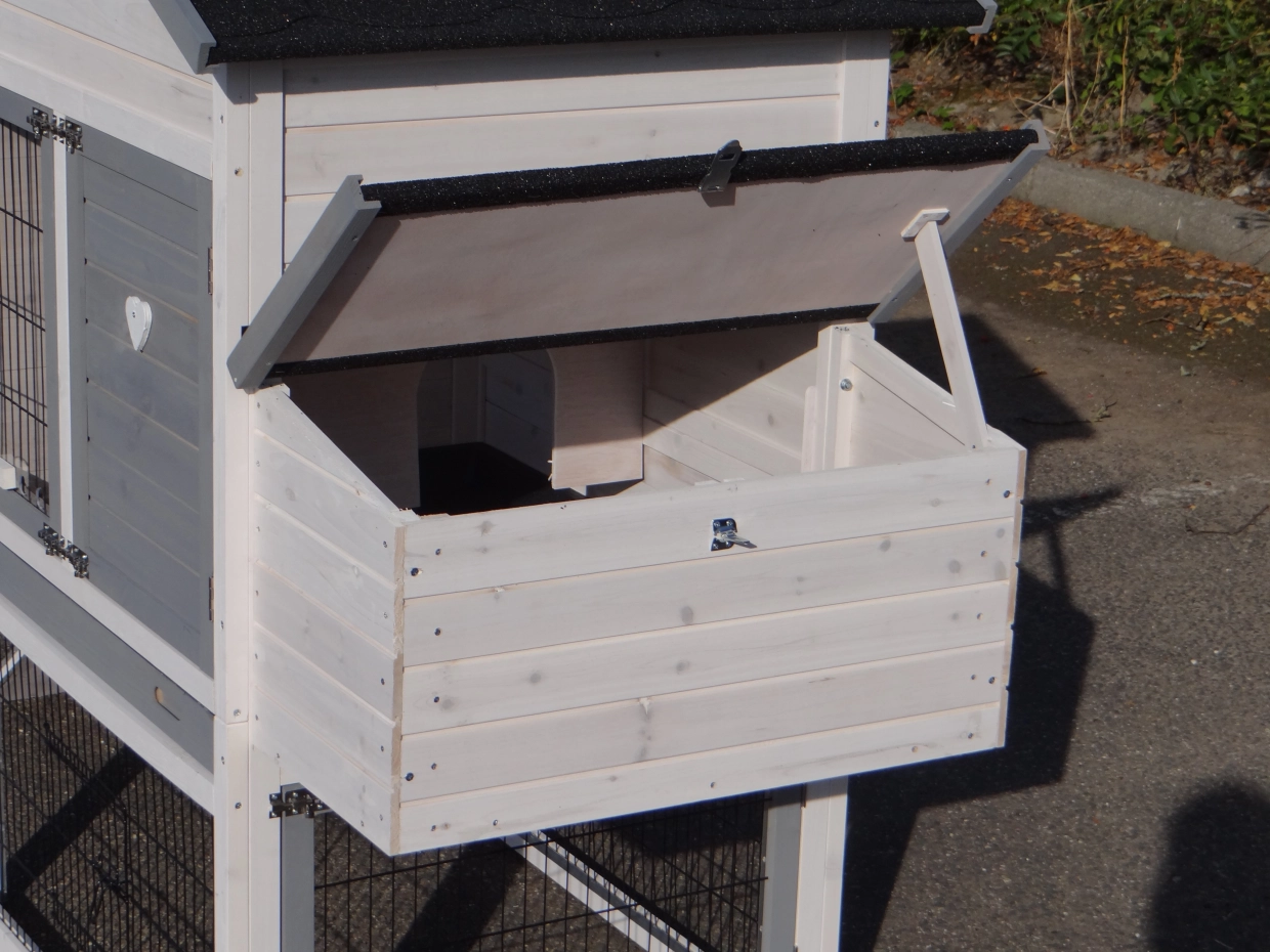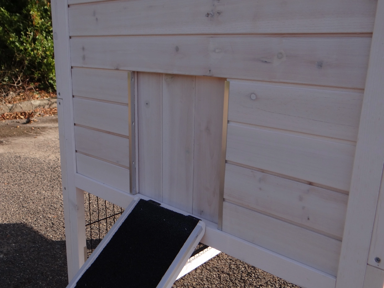 - Het hok heeft anti-knaagstrips op de meest gevoelige plekken, maar is niet volledig beschermd. Voor onbeschermde randen kunt u extra anti-knaagstrips mee bestellen.