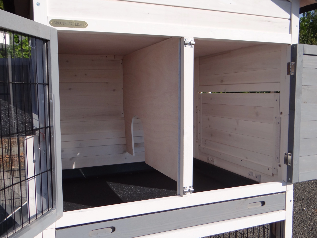Konijnenhok Prestige Medium Antiknaag met linkerren en nest. Konijnenhok Prestige Medium Anti Knaag met nest en linkerren is 'n geweldig hok voor meerdere konijnen, of grote konijnen. Dit konijnenhok is tot in detail uitstekend afgewerkt met diverse ruime deuren, royaal nachthok, handig nest en ruime ren. Voor de optimale bescherming staat het konijnenhok op rubberen poten. Dit maakt konijnenhok Prestige Medium Anti Knaag zeer praktisch in gebruik. U kunt dit konijnenhok ook met kleine aanpassing eenvoudig andersom opbouwen.