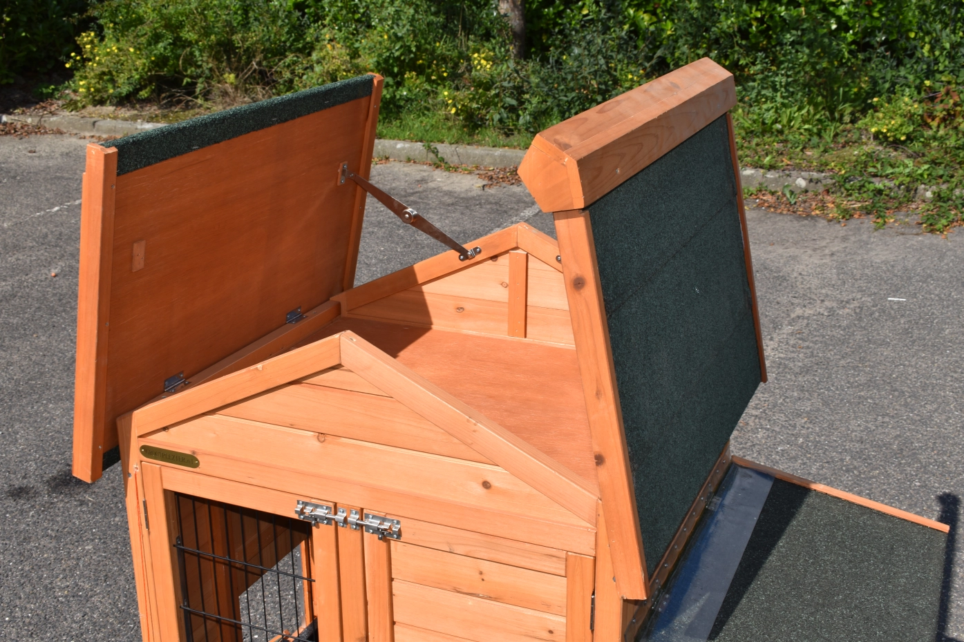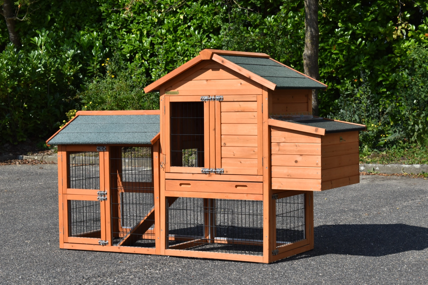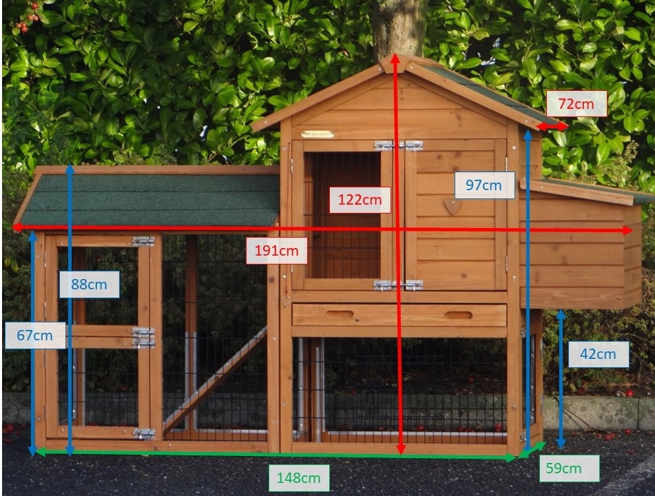 Het konijnenhok Prestige Small heeft links een aanbouwren en rechts een nestkast. Het konijnenhok heeft een scharnierend dak, een handige bergzolder, een schuiflade en ruime deuren. Het hok biedt plaats voor 2 konijnen. De maximale afmetingen, inclusief dak en nestkast, zijn 191x72x122cm.