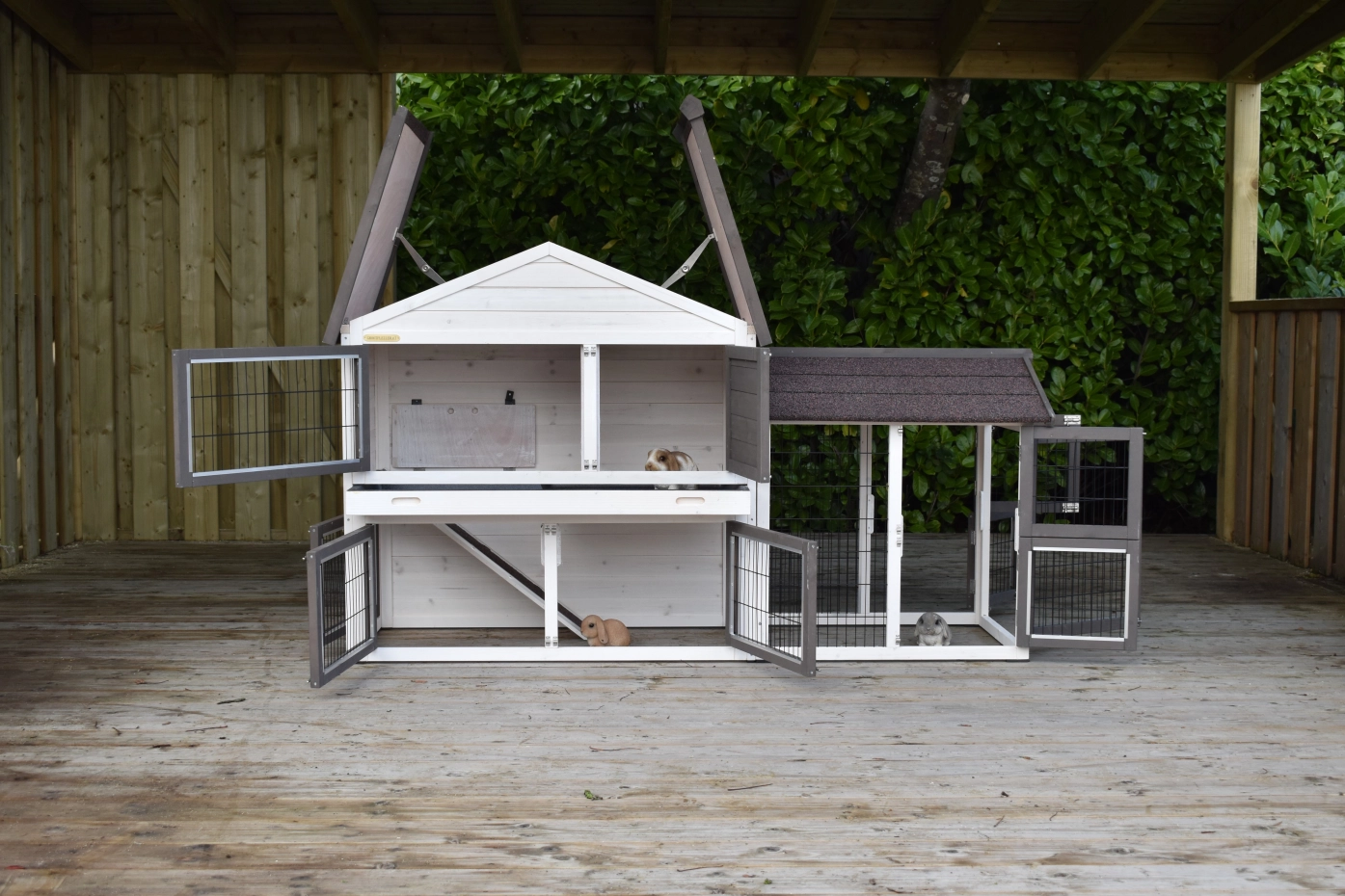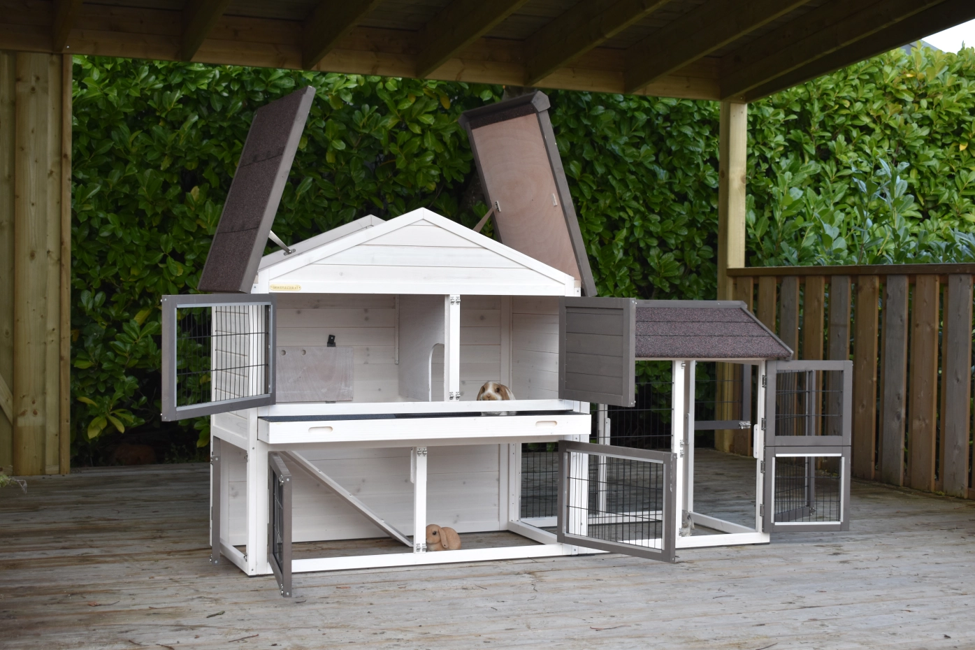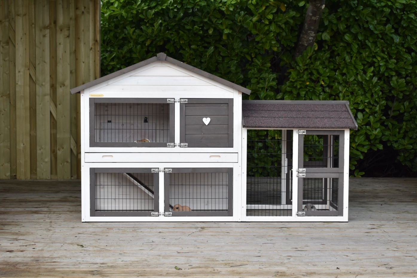 - Het hok heeft anti-knaagstrips op de meest gevoelige plekken, maar is niet volledig beschermd. Voor onbeschermde randen kunt u extra anti-knaagstrips mee bestellen.