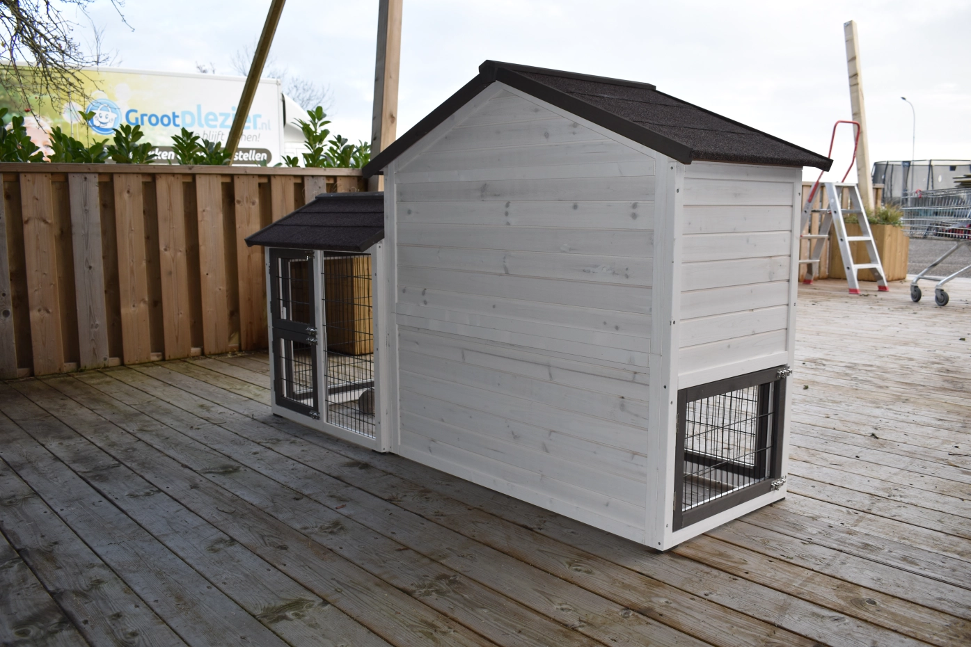 - Wanneer het hok niet op een beschutte plaats staat, dan adviseren wij om het te verankeren