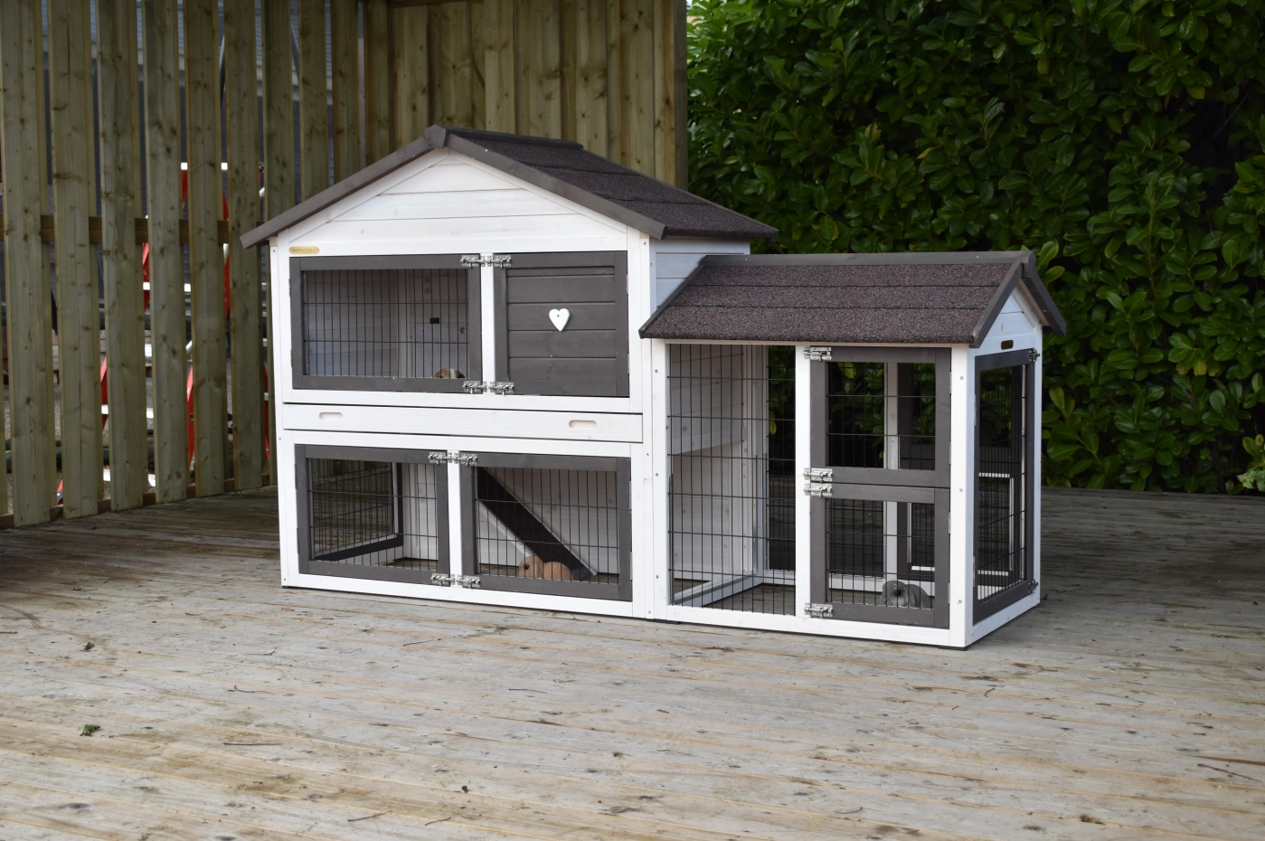 Het Konijnenhok Regular Medium met een rechtse aanbouwren, voorzien van anti-knaagranden, is uniek en zeer praktisch. In dit konijnenhok Regular Medium kunnen de konijnen van boven naar beneden, en de verdiepingsvloer is afsluitbaar. Het hok Regular Medium heeft ook een schuiflade, waardoor het eenvoudig schoon te maken is. Met een handige bergzolder voor opslag van benodigdheden.
