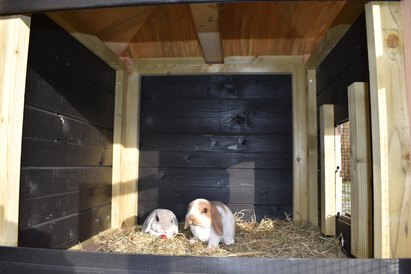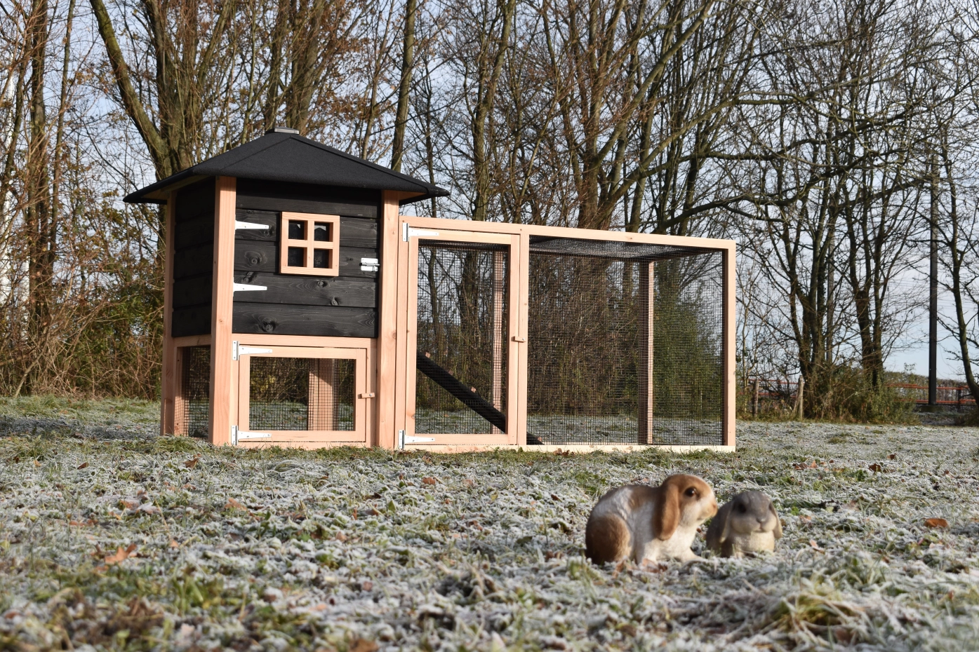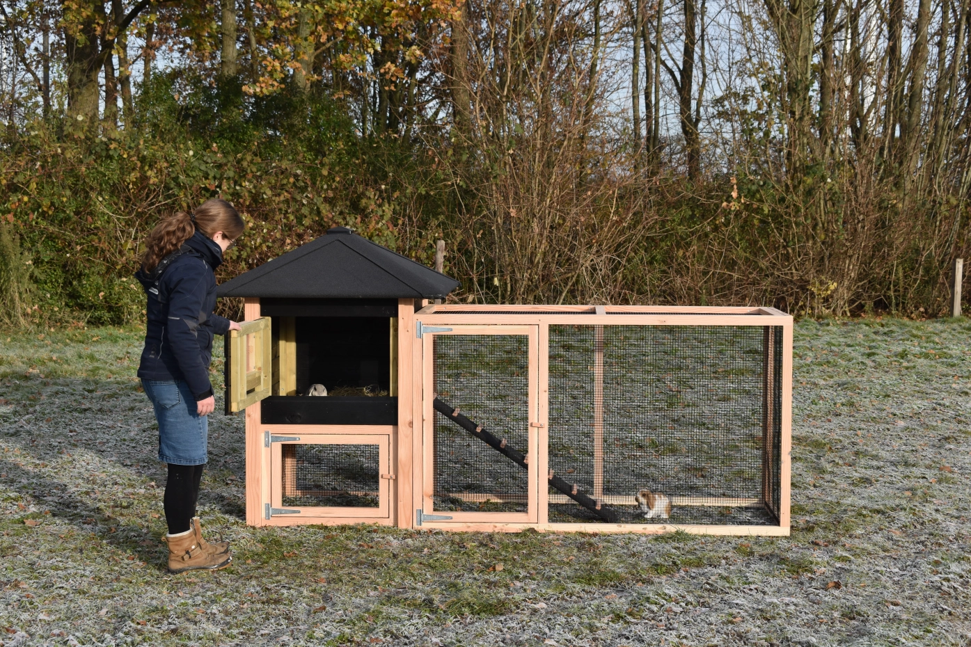 Konijnenhok Rosy is uitgebreid met een grote aanbouwren. Het hok is gemaakt van Douglashout en zwart geïmpregneerd vurenhout. Door de grote deuren kan het hok makkelijk schoongemaakt worden. Kortom, een leuk hok voor een leuke prijs!
