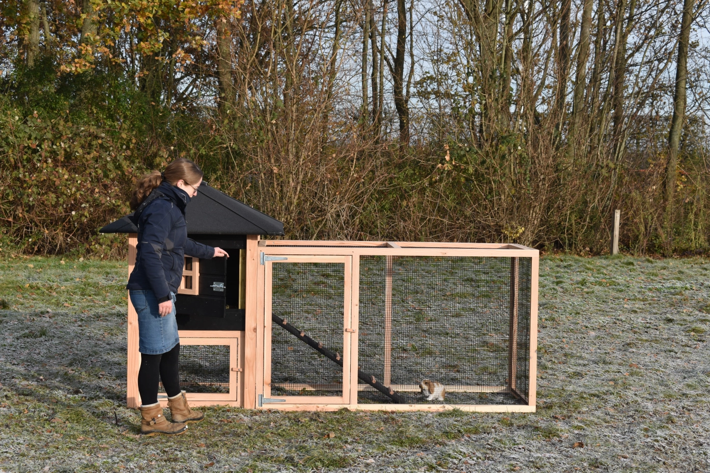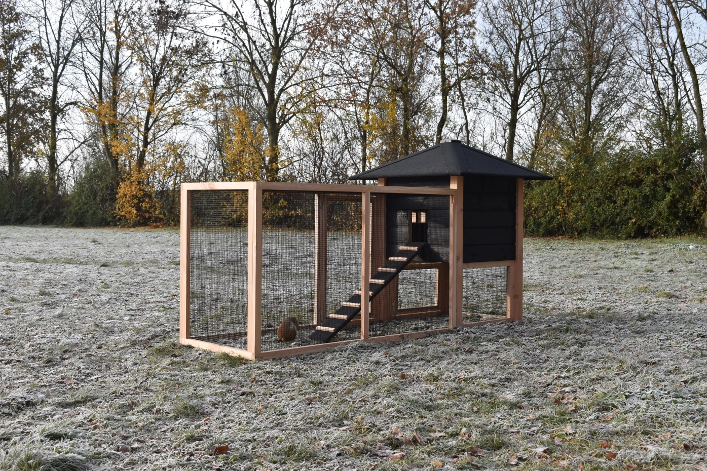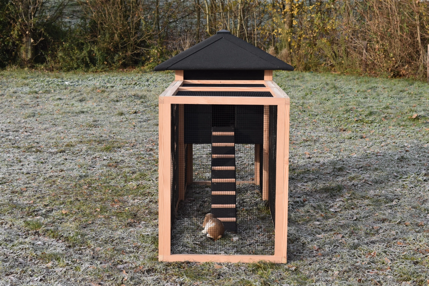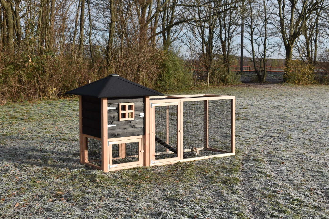 Konijnenhok Rosy is uitgebreid met een grote aanbouwren. Het hok is gemaakt van Douglashout en zwart geïmpregneerd vurenhout. Door de grote deuren kan het hok makkelijk schoongemaakt worden. Kortom, een leuk hok voor een leuke prijs!