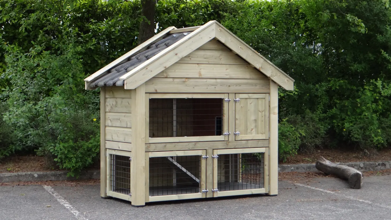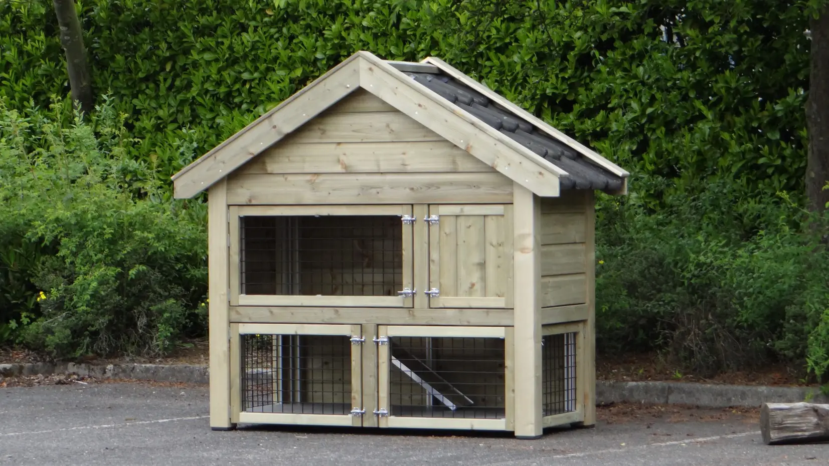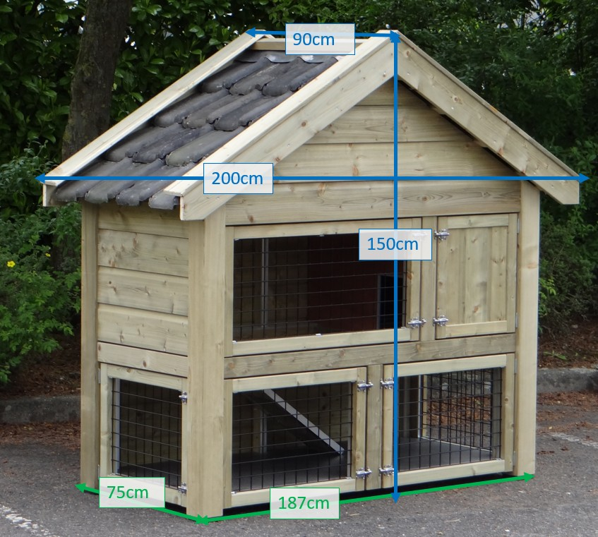 Konijnenhok Sjoerd is een uiterst luxe konijnenhok met 2 verdiepingen en een echt pannendak. Dit konijnenhok is gemaakt van geïmpregneerd hout, waardoor het niet meer behandeld hoeft te worden. Het konijnenhok is volledig voorzien van anti-knaagstrips. Het hok heeft veel grote deuren en twee schuiflades. Hierdoor is het konijnenhok gemakkelijk schoon te maken. Het konijnenhok wordt compleet gemonteerd geleverd!