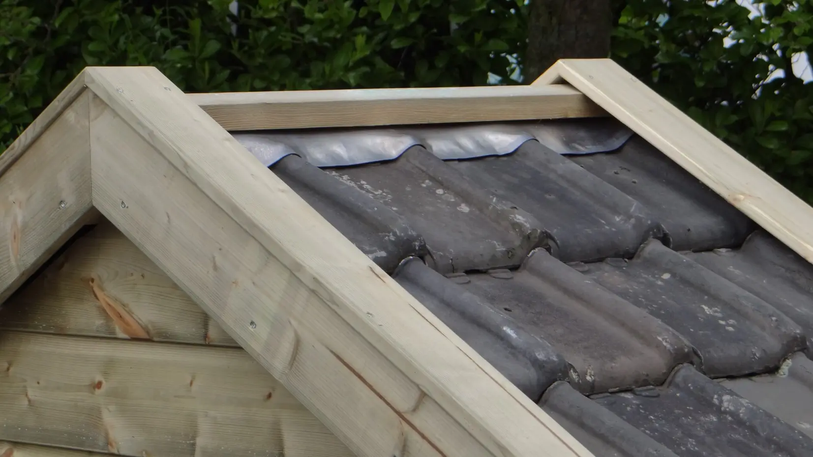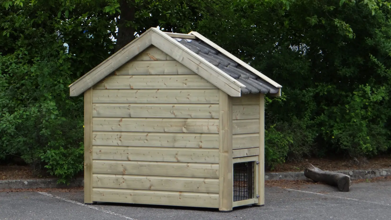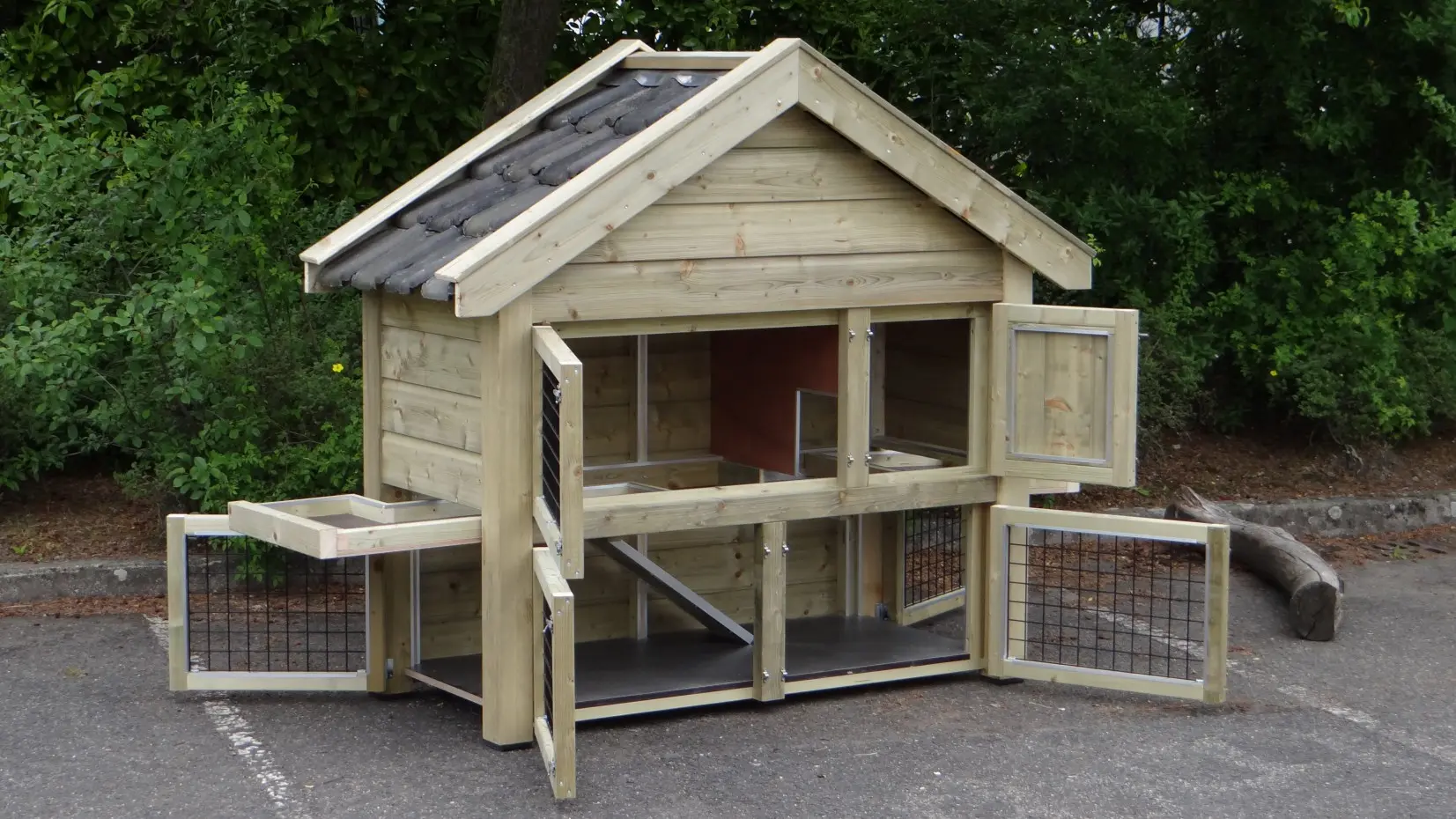 - Het hok is gemaakt van geïmpregneerd vurenhout, betonplex en echte dakpannen