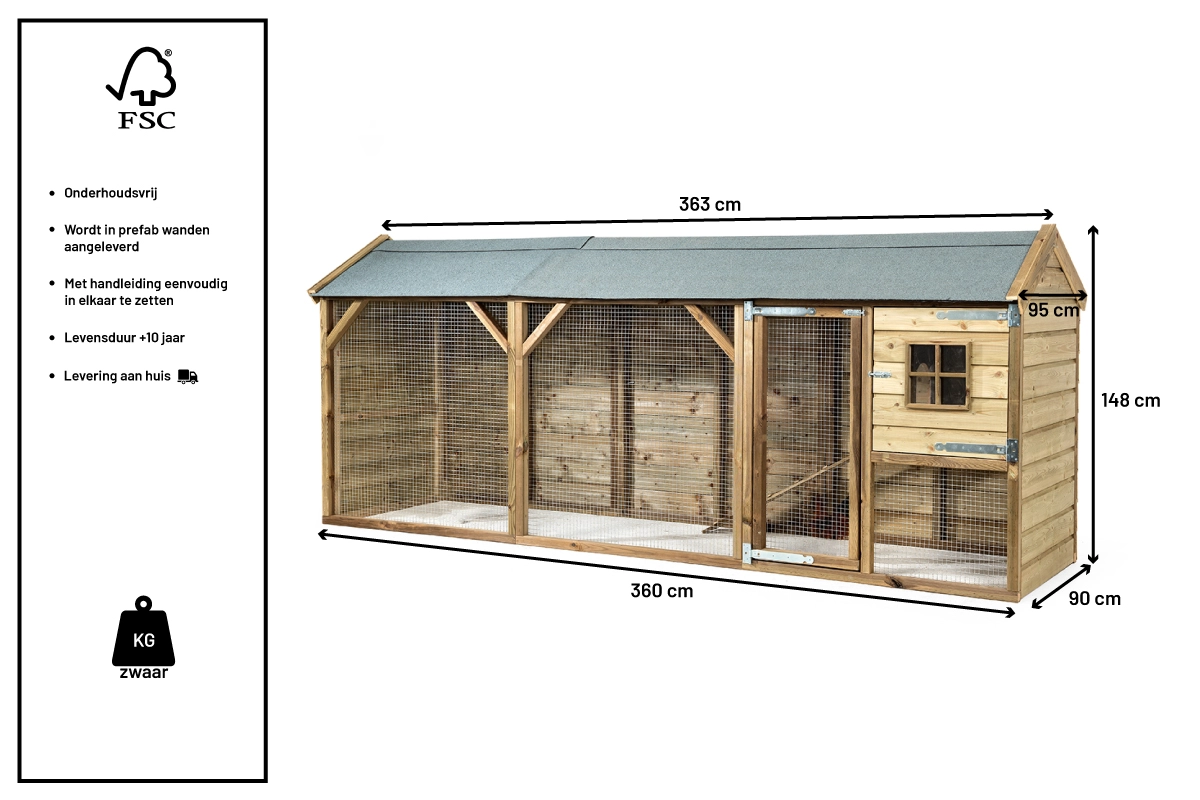 | Buitenwerkse afmetingen incl. dak (BxDxH) | 363x95x148cm |