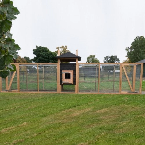 • Dit dierenverblijf wordt gemaakt van een geïmpregneerd grenen frame. De afwerking is met Douglashout en zwarte potdeksel planken. Dat maakt het hok onderhoudsvrij en zorgt voor een lange levensduur