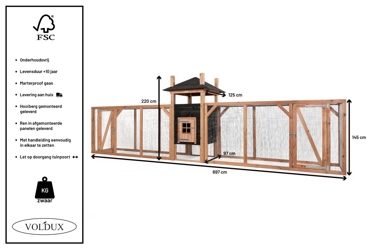 Buitenwerkse afmetingen incl. dak (BxDxH) 697x125x220cm
