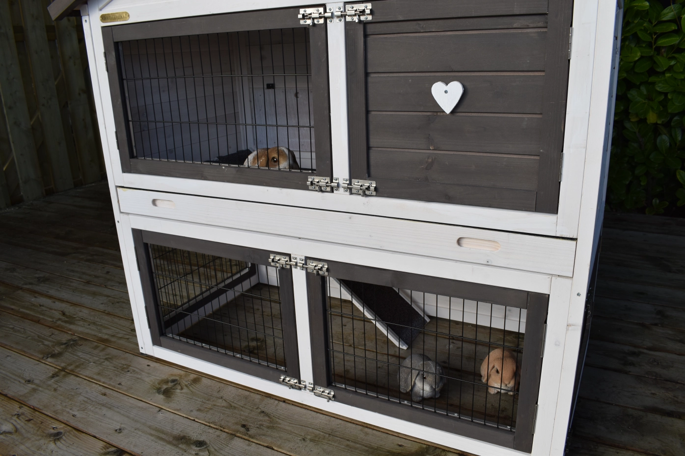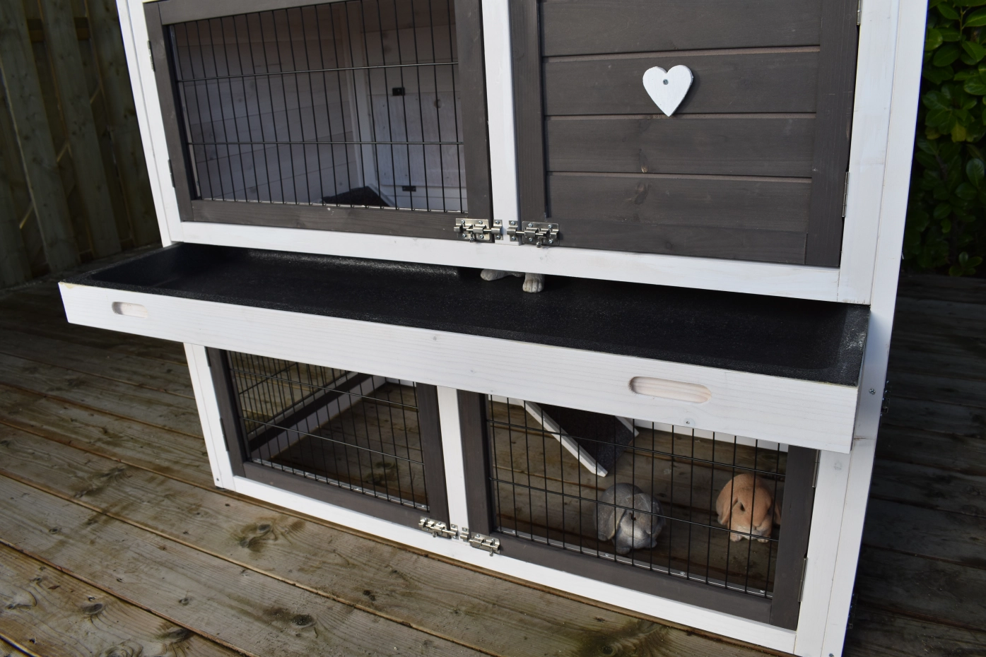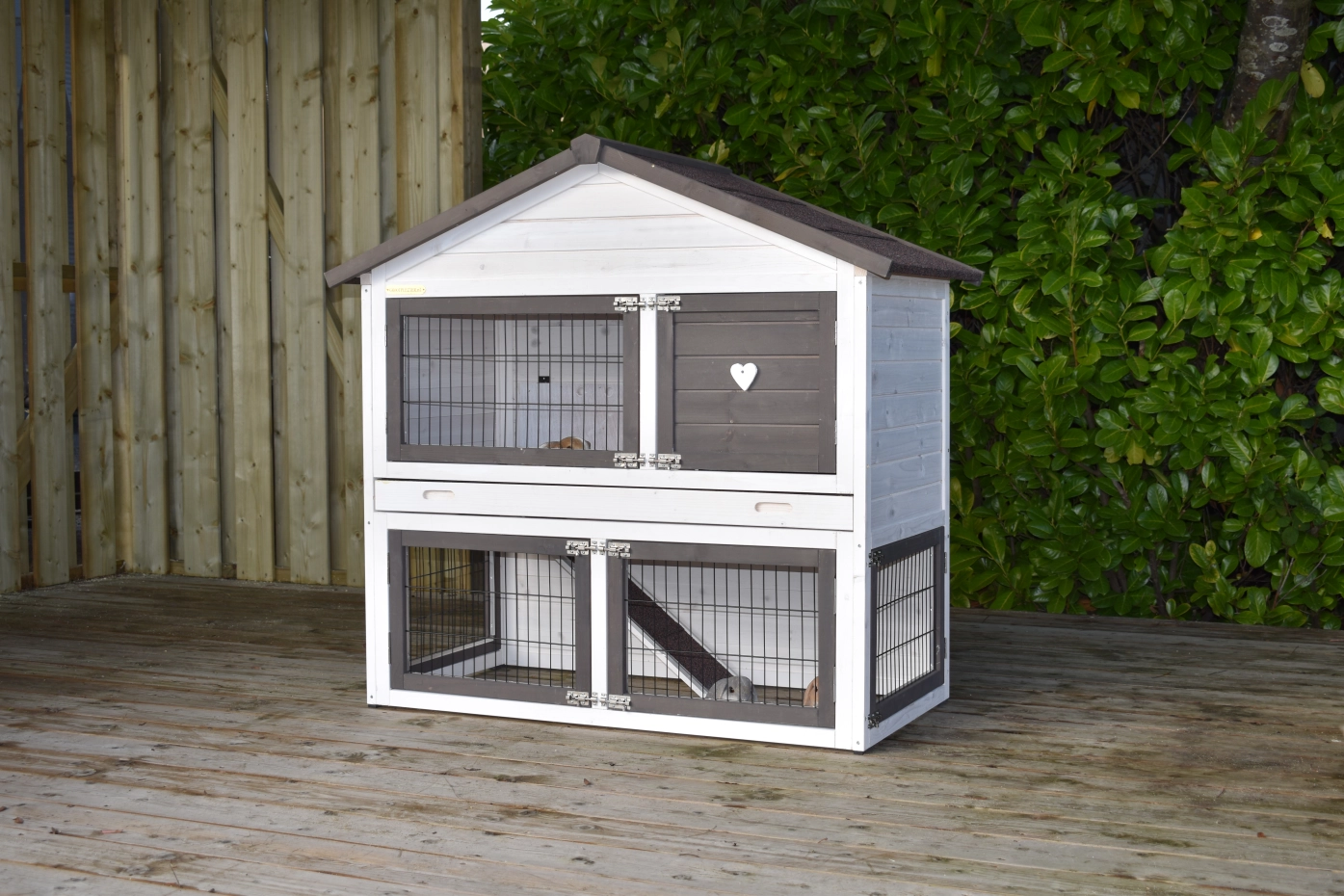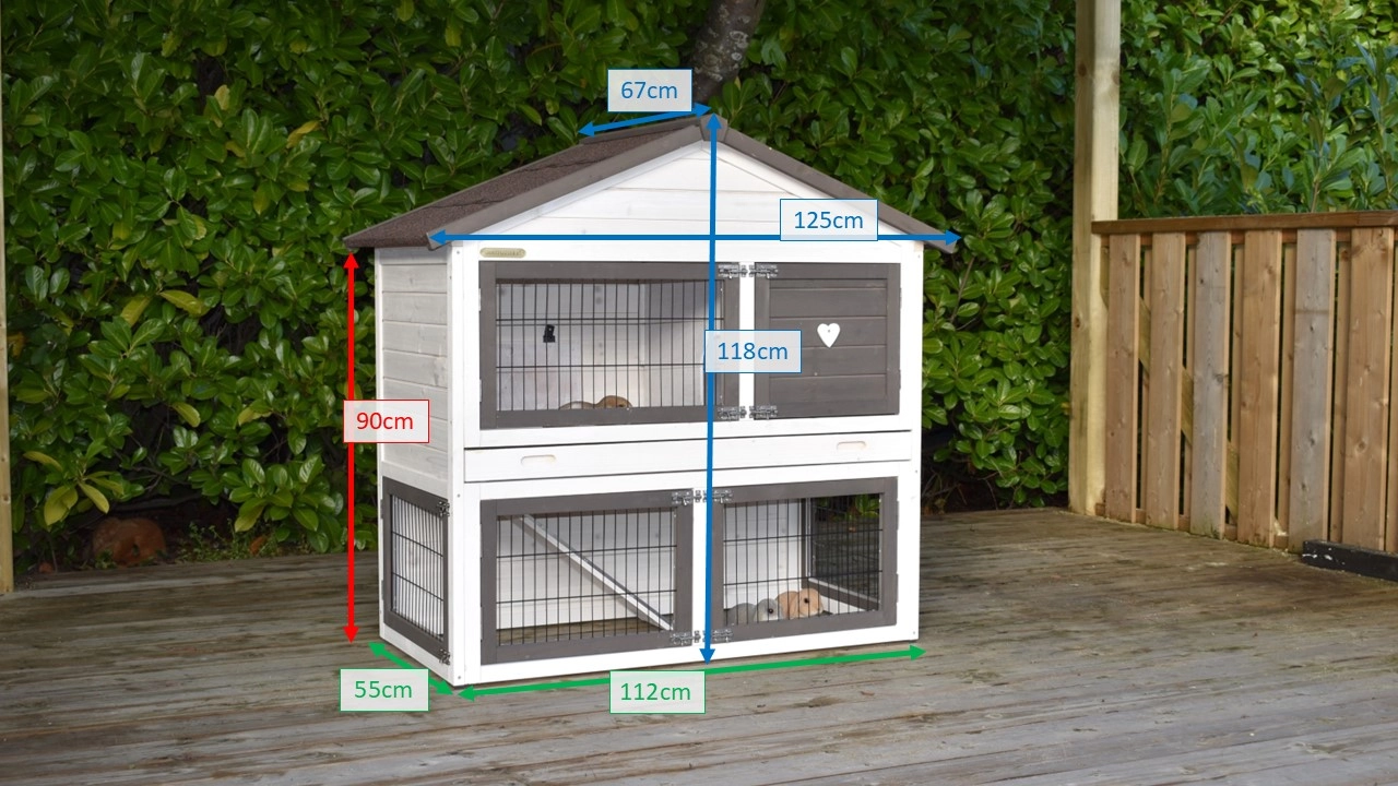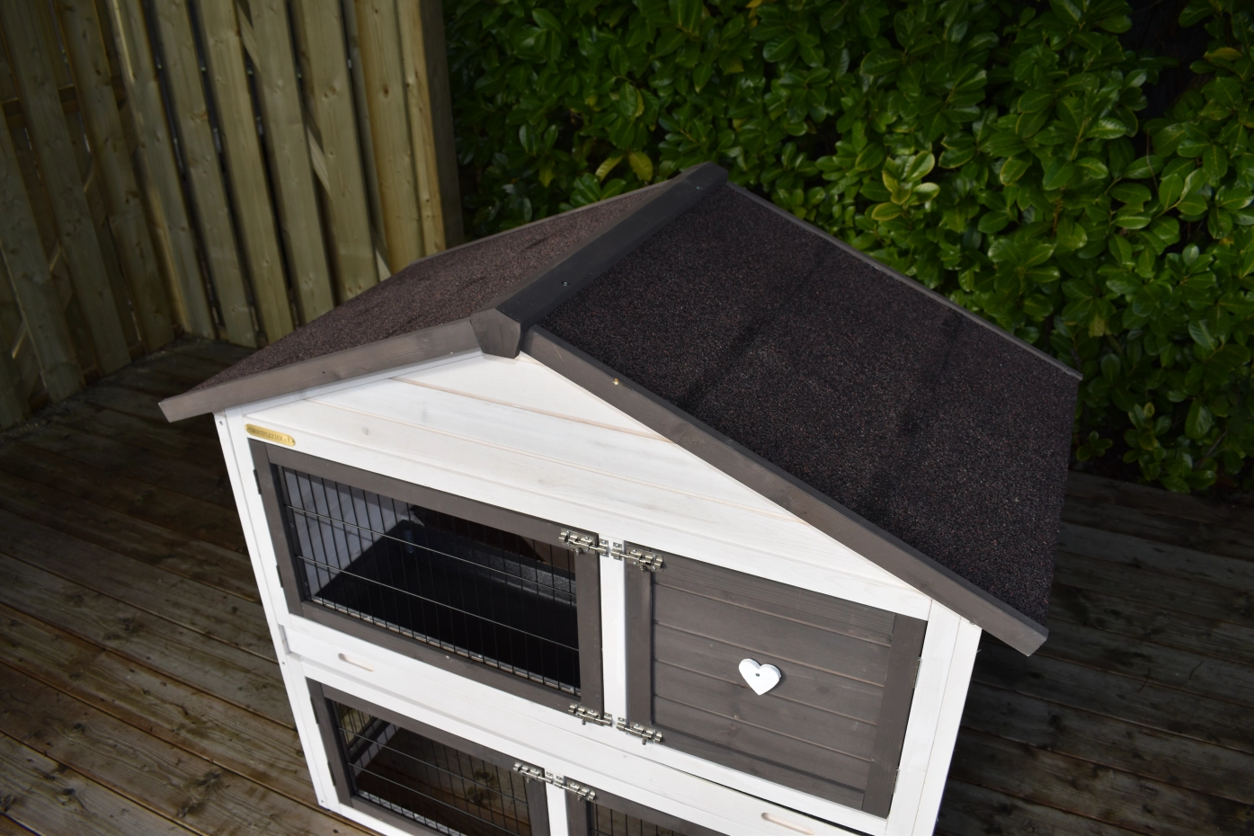 Konijnenhok Regular Medium Anti-knaag is een prachtig konijnenhok. Dit hok is geschikt voor 2 middelgrote konijnen, of 3 dwergkonijntjes. Door de handige schuiflade is het eenvoudig schoon te maken. Zowel het konijnenhok als de onderren zijn voorzien van ruime deuren. Het dak, met daaronder een handige opbergzolder, is voorzien van dakleer. De konijnen kunnen beide verdiepingen bereiken door een loopplank. De onderren is eventueel af te sluiten. Er zijn anti-knaagstrips aangebracht op de meest gevoelige plaatsen. Dit konijnenhok is voorzien van rubberen voetjes. De maximale afmetingen, inclusief dak, zijn 125x67x118cm.