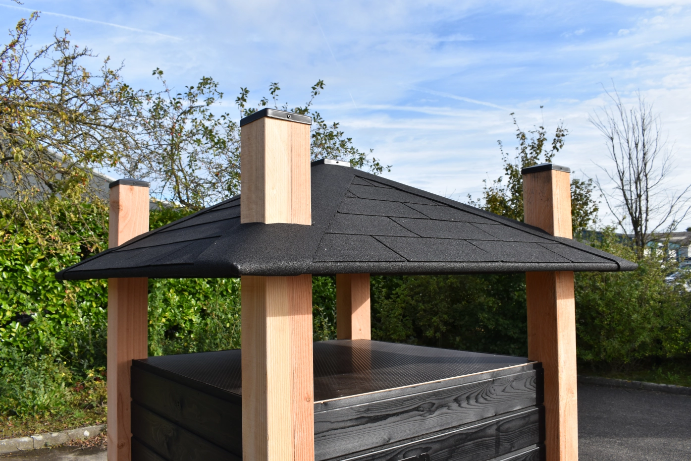 - Het dak is gemaakt van underlayment en bekleed met dakshingles/dakleer