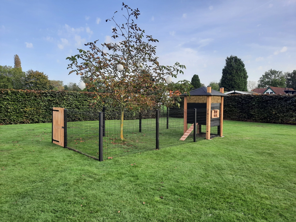 Konijnenhok Hooiberg Sjors heeft een charmante landelijke uitstraling. Dit ruime verblijf past perfect in een landelijke tuin of op de boerderij. Dankzij de royale afmetingen is er volop plek voor meerdere konijnen. Aan het hok zit een grote ren van 123 cm hoog, gemaakt van stevige afrasteringspanelen en voorzien van een houten deur. Zo kunnen je konijnen veilig én met veel bewegingsvrijheid rondhuppelen. Via de grote deur stap je eenvoudig naar binnen voor verzorging en schoonmaak. Binnen is er voldoende beschutting voor rustmomenten en om te schuilen. De bodem is gemaakt van beton-multiplex: sterk, onderhoudsvriendelijk en bestand tegen intensief gebruik.