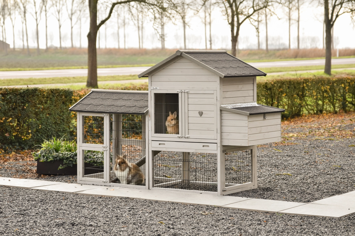 Konijnenhok Prestige Medium Antiknaag met linkerren en nest. Konijnenhok Prestige Medium Anti Knaag met nest en linkerren is 'n geweldig hok voor meerdere konijnen, of grote konijnen. Dit konijnenhok is tot in detail uitstekend afgewerkt met diverse ruime deuren, royaal nachthok, handig nest en ruime ren. Voor de optimale bescherming staat het konijnenhok op rubberen poten. Dit maakt konijnenhok Prestige Medium Anti Knaag zeer praktisch in gebruik. U kunt dit konijnenhok ook met kleine aanpassing eenvoudig andersom opbouwen.