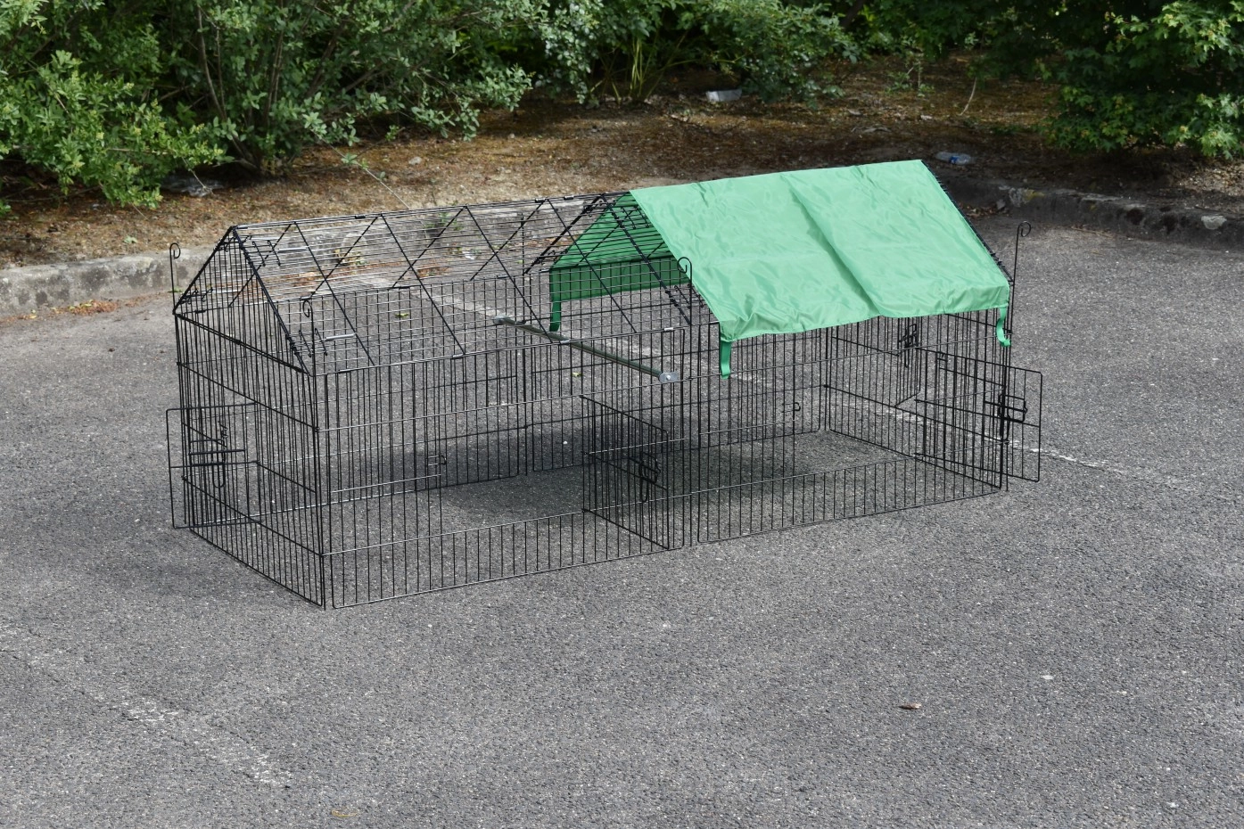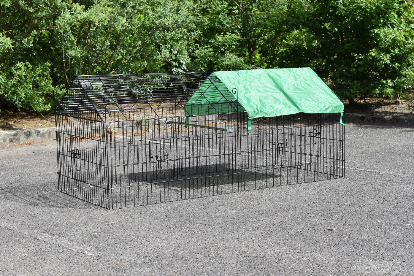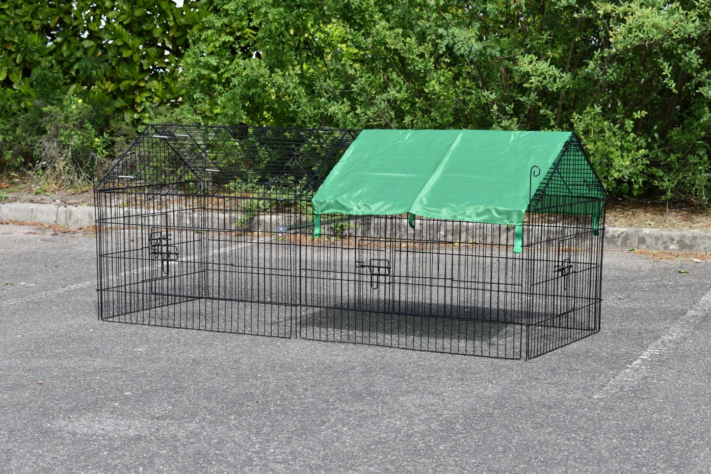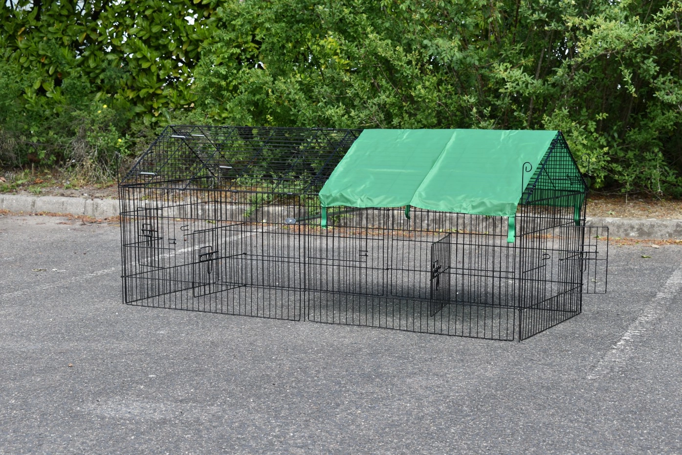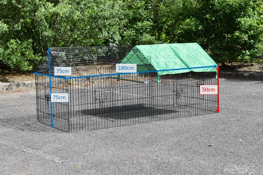 Puntdak konijnenren Elynn met zonnescherm is een loopren, gemaakt van traliewerk van zwart gepoedercoat staal. De konijnenren met zonnescherm is te gebruiken als konijnenren, kippenren, kattenren, puppyren en ook voor katten en kleine hondjes is deze loopren met zonnescherm uitermate geschikt. Deze handige loopren met zonnescherm is voorzien van maar liefst 4 deuren in het traliewerk. De konijnenren is eindeloos uit te breiden, en meestal eenvoudig te combineren met een kippenhok of konijnenhok, of een ander dierenhok. De zijkant van deze ren (het steile gedeelte) is ongeveer 50cm hoog.