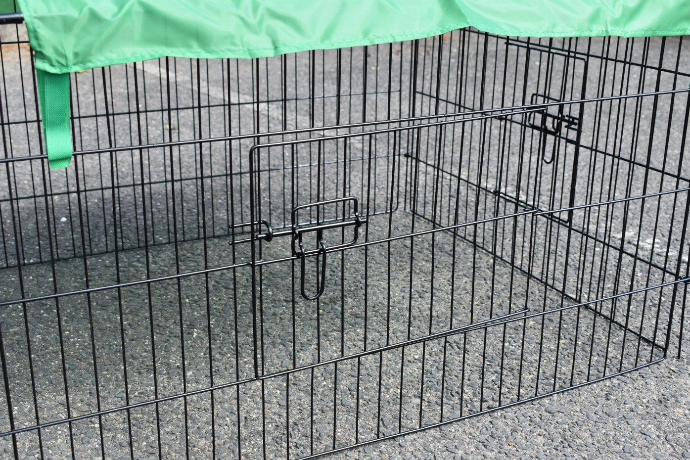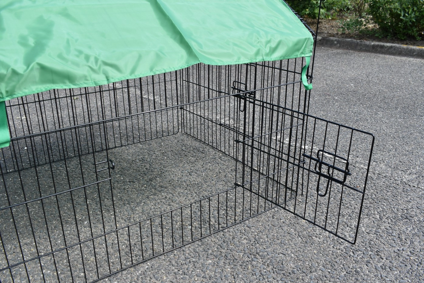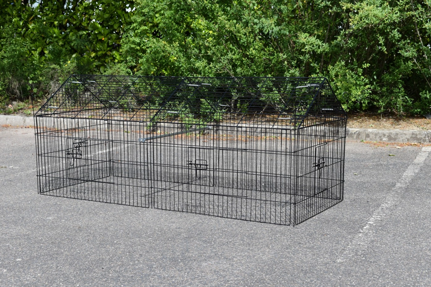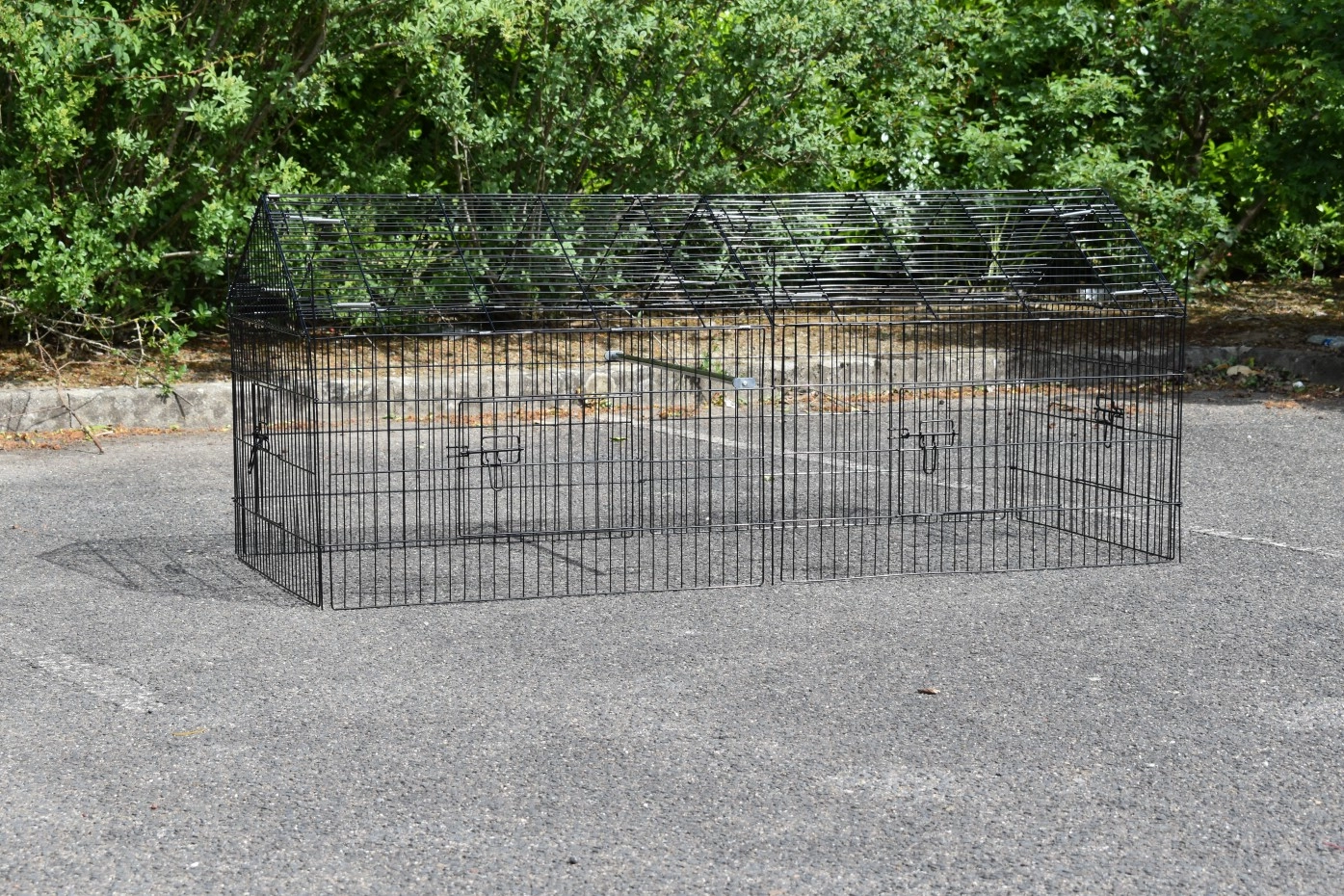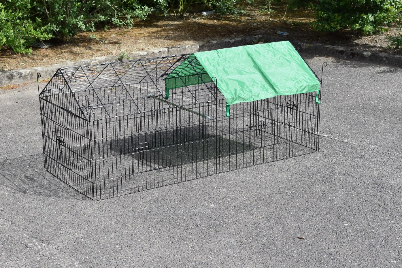 Puntdak konijnenren Elynn met zonnescherm is een loopren, gemaakt van traliewerk van zwart gepoedercoat staal. De konijnenren met zonnescherm is te gebruiken als konijnenren, kippenren, kattenren, puppyren en ook voor katten en kleine hondjes is deze loopren met zonnescherm uitermate geschikt. Deze handige loopren met zonnescherm is voorzien van maar liefst 4 deuren in het traliewerk. De konijnenren is eindeloos uit te breiden, en meestal eenvoudig te combineren met een kippenhok of konijnenhok, of een ander dierenhok. De zijkant van deze ren (het steile gedeelte) is ongeveer 50cm hoog.