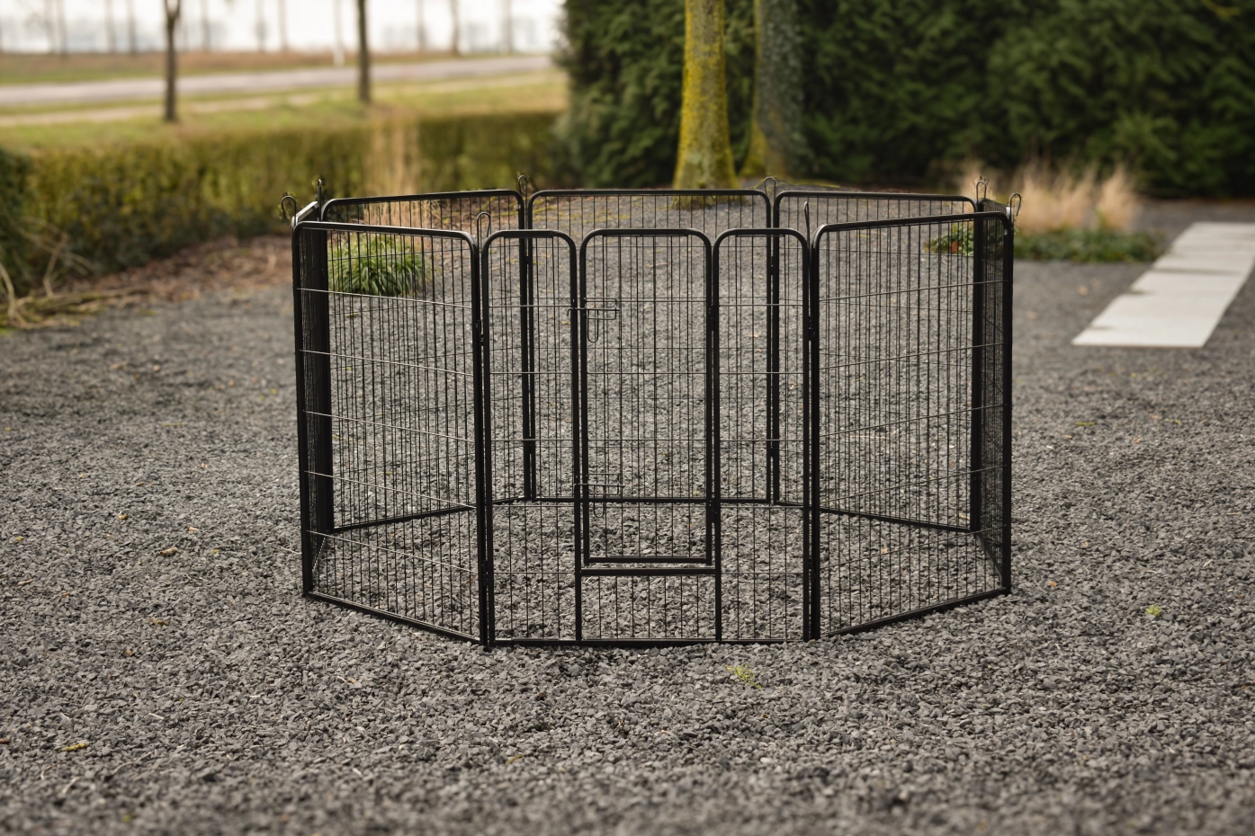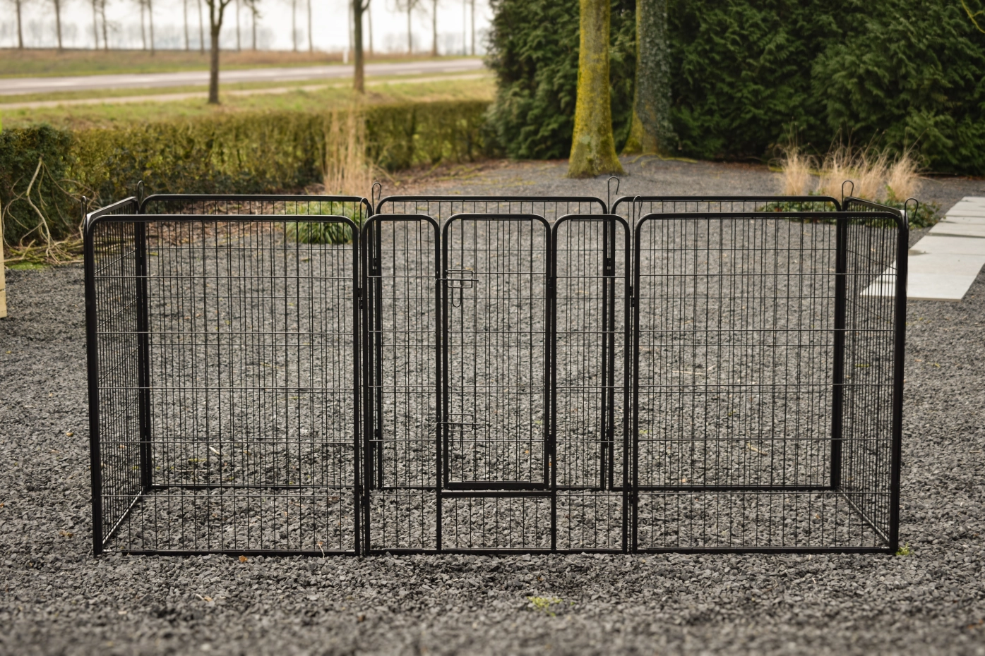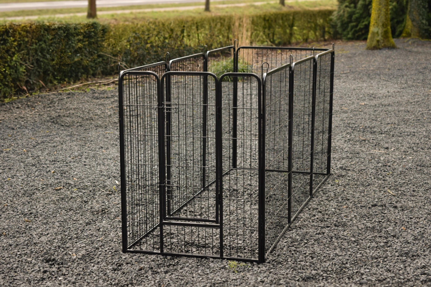 Konijnenren Octa met een hoogte van 100cm. Deze konijnenren is gemaakt van gepoedercoat staal. Konijnenren Octa bestaat uit 8 panelen van ca. 79x100cm. De totale omtrek van deze ren is dus zo'n 640cm. De Octa wordt vaak gebruikt voor konijnen en voor puppy's, maar kan natuurlijk prima als dierenren voor allerlei andere dieren gebruikt worden.