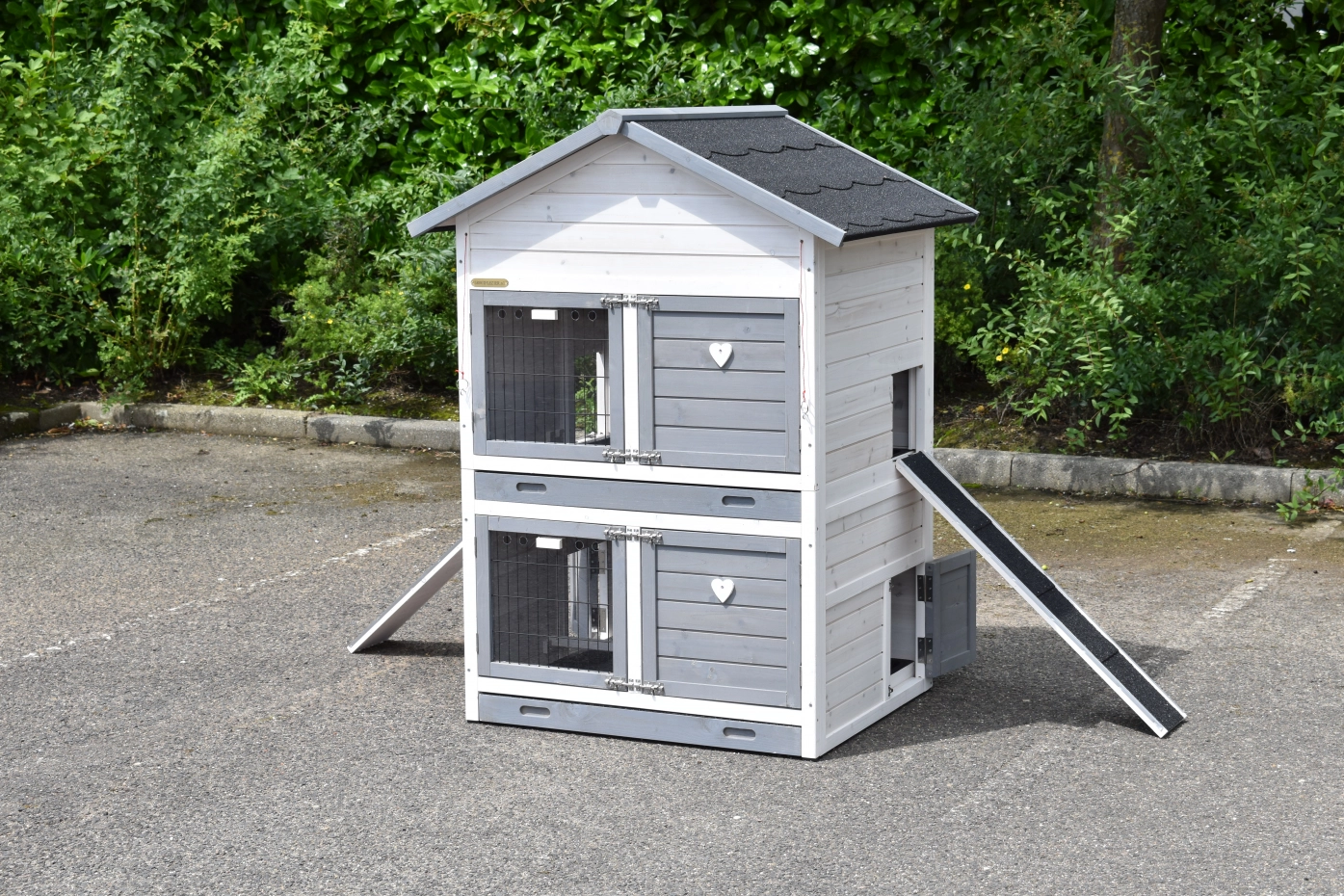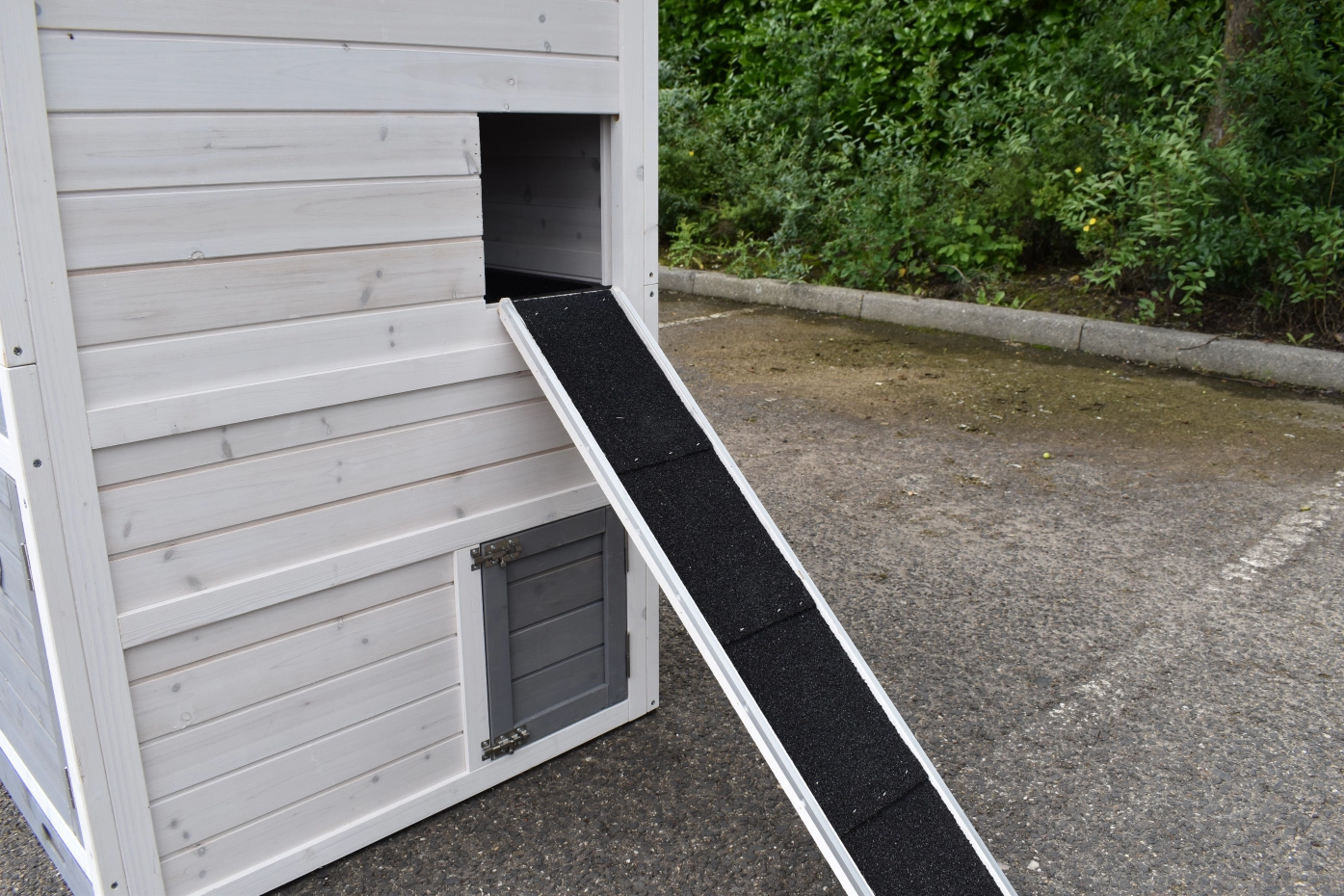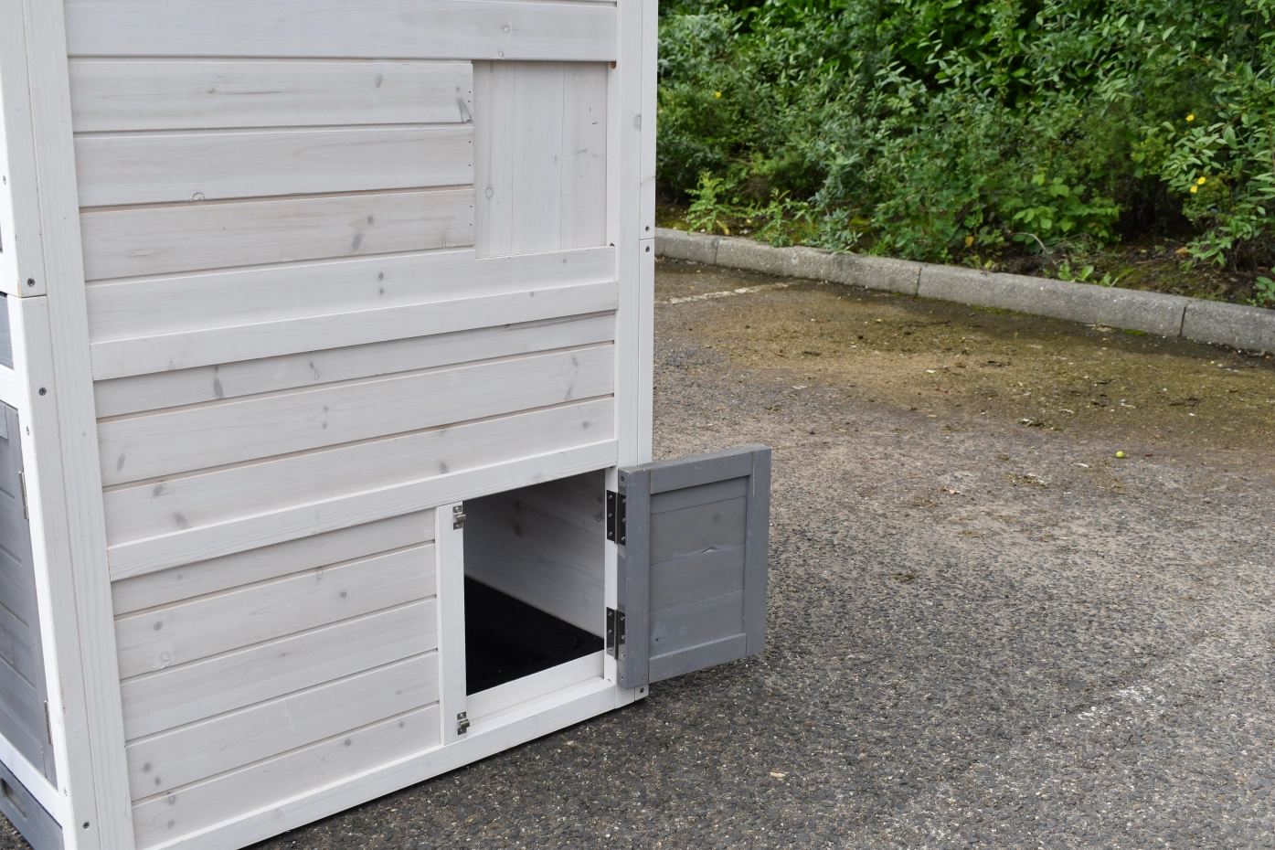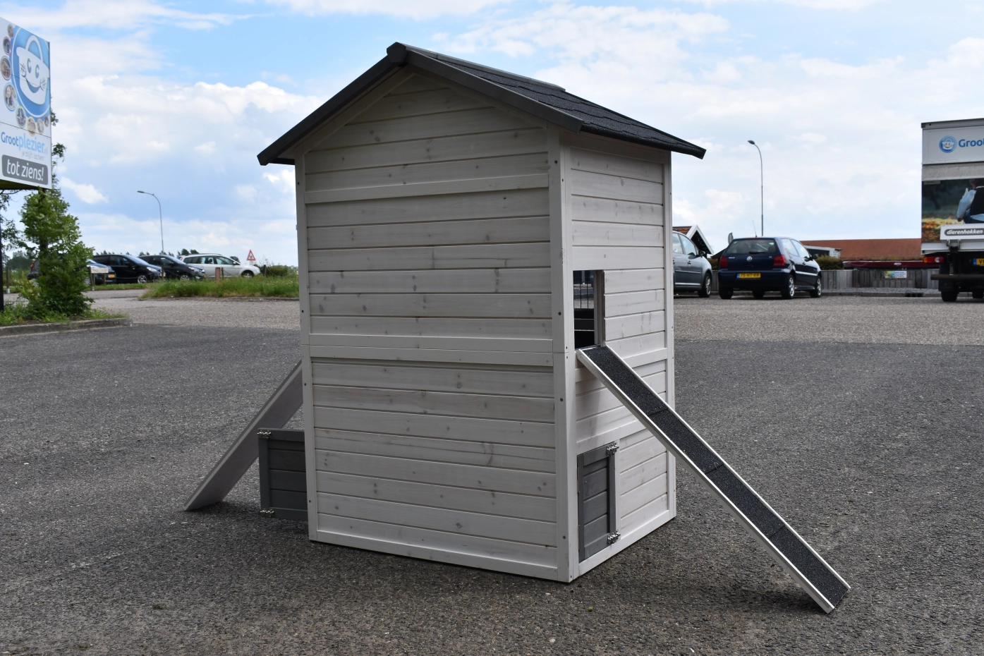 - Wanneer het hok niet op een beschutte plaats staat, dan adviseren wij om het te verankeren