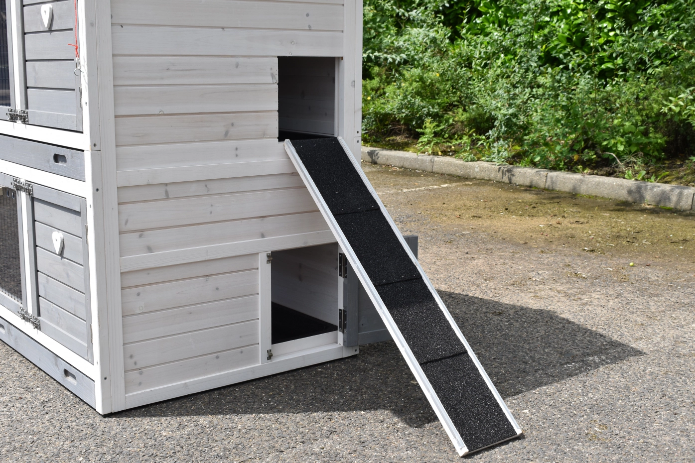 - Het hok heeft anti-knaagstrips op de meest gevoelige plekken, maar is niet volledig beschermd. Voor onbeschermde randen kunt u extra anti-knaagstrips mee bestellen.