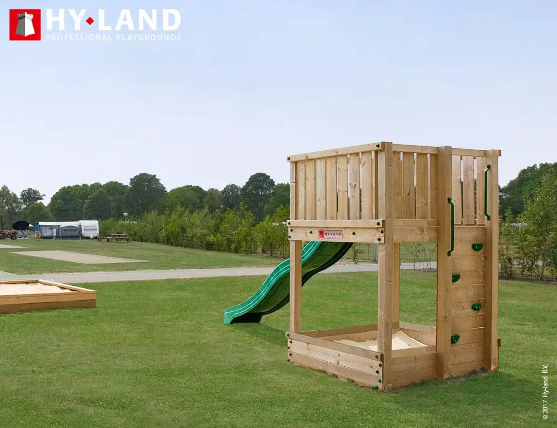 Compacte speeltoren van Hy-Land met klimwand met composiet klimgrepen en zandbak.