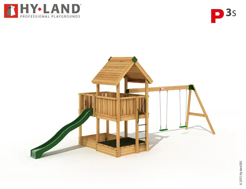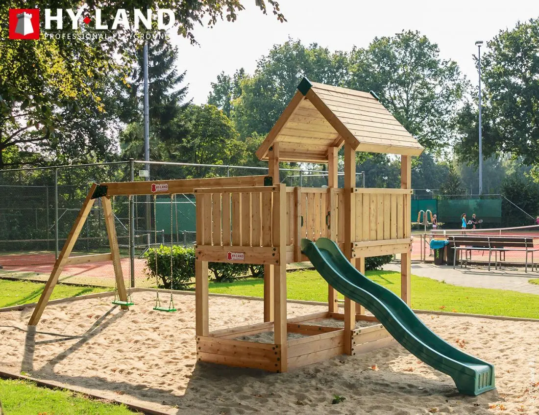 - Het Hy-Land speeltoestel wordt geleverd in geïmpregneerd vurenhout
