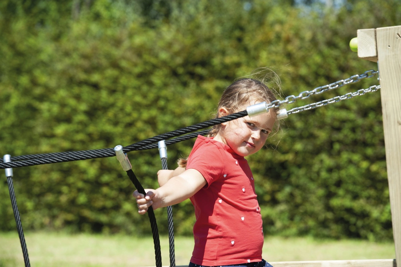Loop over de wiebelende evenwichtsbalk naar de uitkijkpost. Kijk goed uit, bewaar je evenwicht en gaan! Zoek de White Rhino's. Zie je de stokstaartjes? Dit openbare Speeltoestel met speelbrug is als een uitkijkpost over de Savannah.
