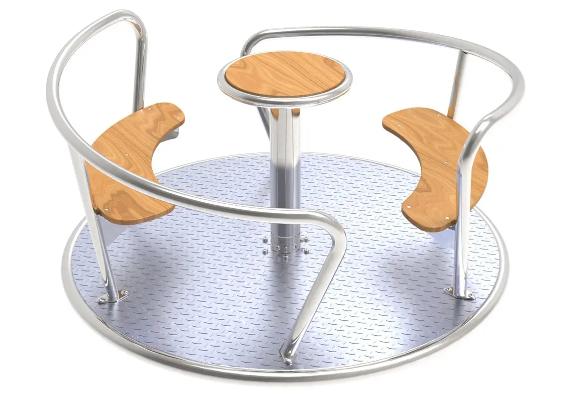 De draaimolen Viento heeft een sterk metalen frame en is beschikbaar in twee uitvoeringen: gepoedercoat staal met HDPE panelen of RVS met houten panelen. De draaimolen Viento RVS is gecertificeerd voor openbaar gebruik en heeft een RVS-frame met twee houten zitjes, geschikt voor ongeveer vijf kinderen. Dankzij het centrale handwiel kunnen kinderen de carrousel veilig zelf laten draaien. De carrousel Viento is een mooie toevoeging aan speeltuin of camping.