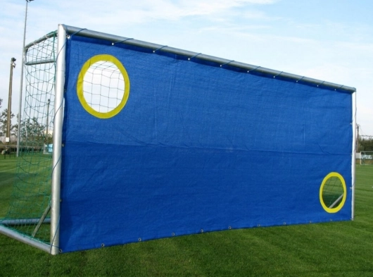 Gaasnet in gebreid UV-gestabiliseerd polyethyleen. Op te hangen in de doelopening, om gericht de traptechniek te oefenen. Rondom gezoomd met messing ringen elke 50 cm en voorzien van 2 openingen met een doorsnede van 50 cm, met duidelijk zichtbare gele rand. Inclusief 20 m bevestigingskoord.