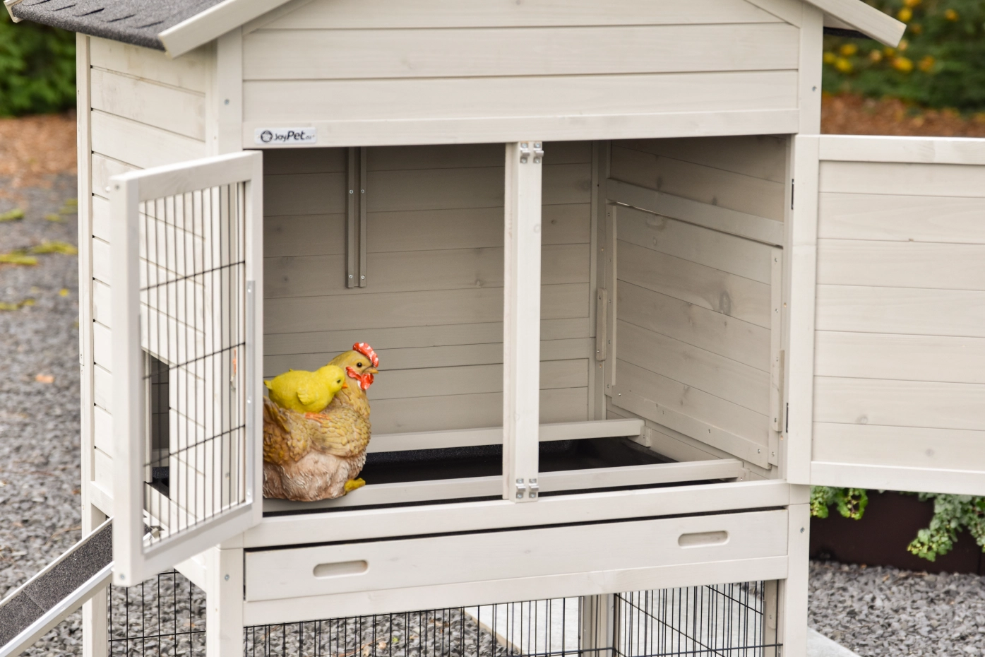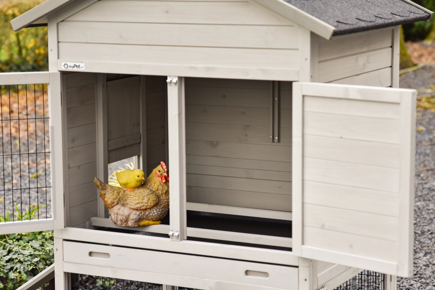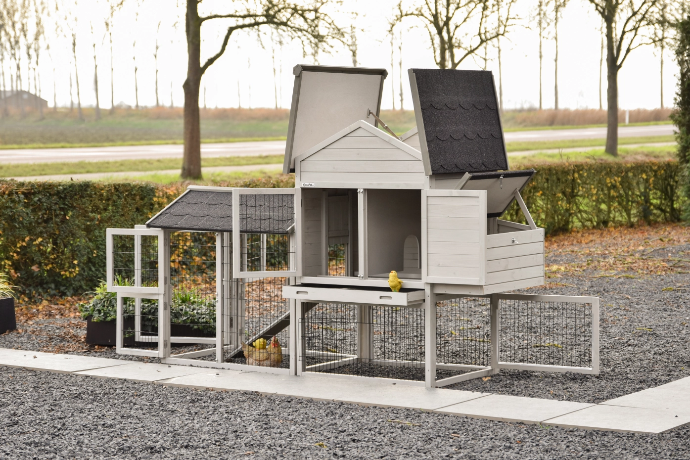 Kippenhok Prestige Medium met linkerren en legnest. Kippenhok Prestige Medium met legnest en linkerren is 'n geweldig hok voor uw kippen. Dit kippenhok is tot in detail uitstekend afgewerkt met diverse ruime deuren, royaal nachthok met zitstokken, handig legnest en ruime ren. Voor de optimale bescherming staat het kippenhok op rubberen poten. Dit maakt kippenhok Prestige Medium zeer praktisch in gebruik. U kunt dit kippenhok ook met kleine aanpassing eenvoudig andersom opbouwen.