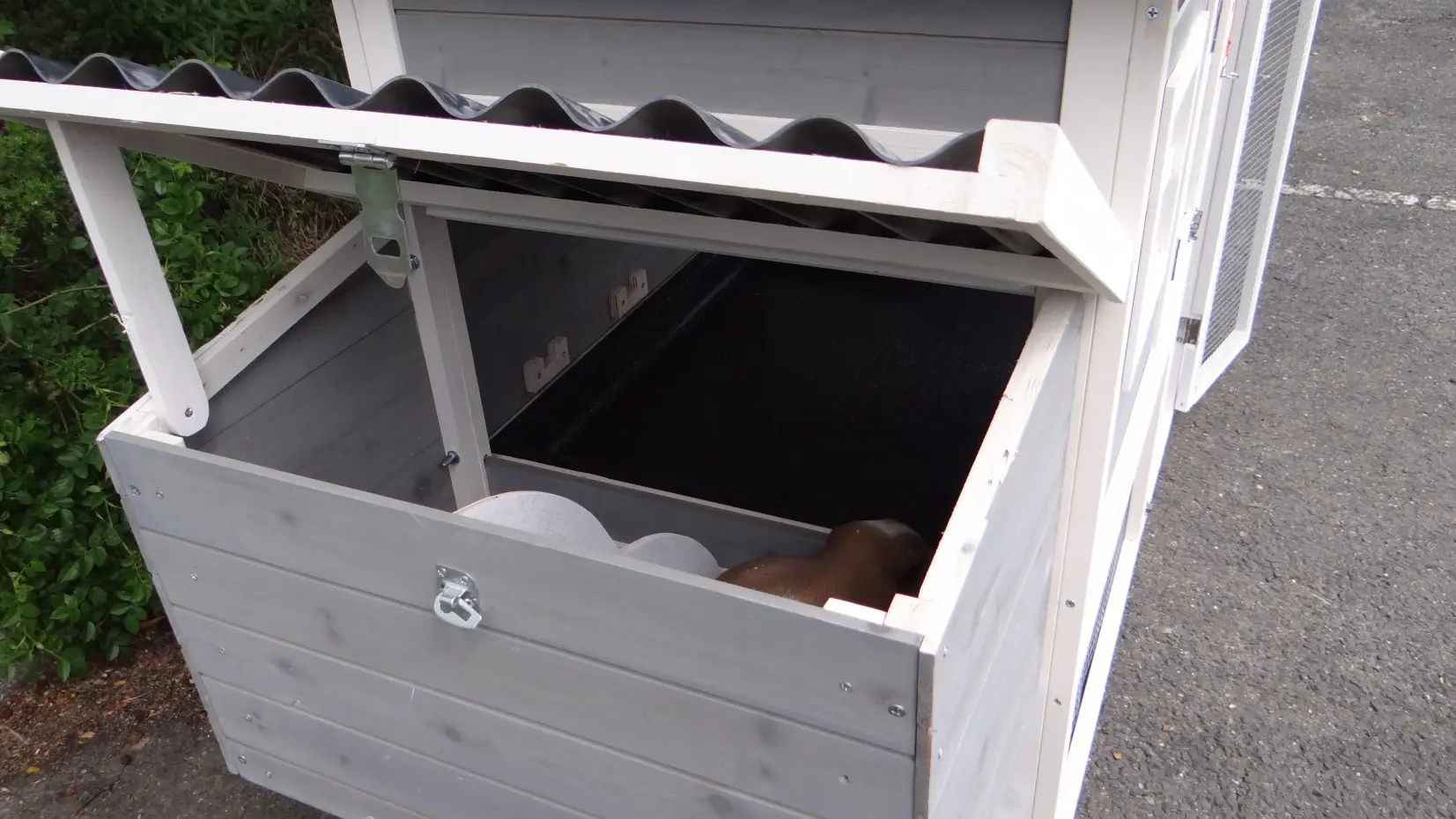 - Wanneer het hok niet op een beschutte plaats staat, dan adviseren wij om het te verankeren