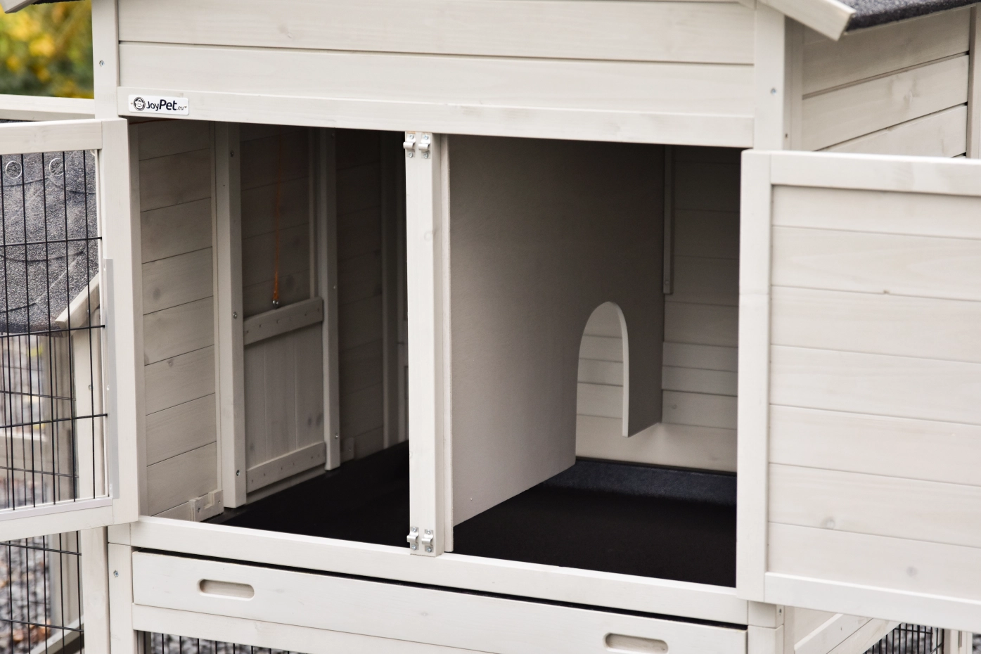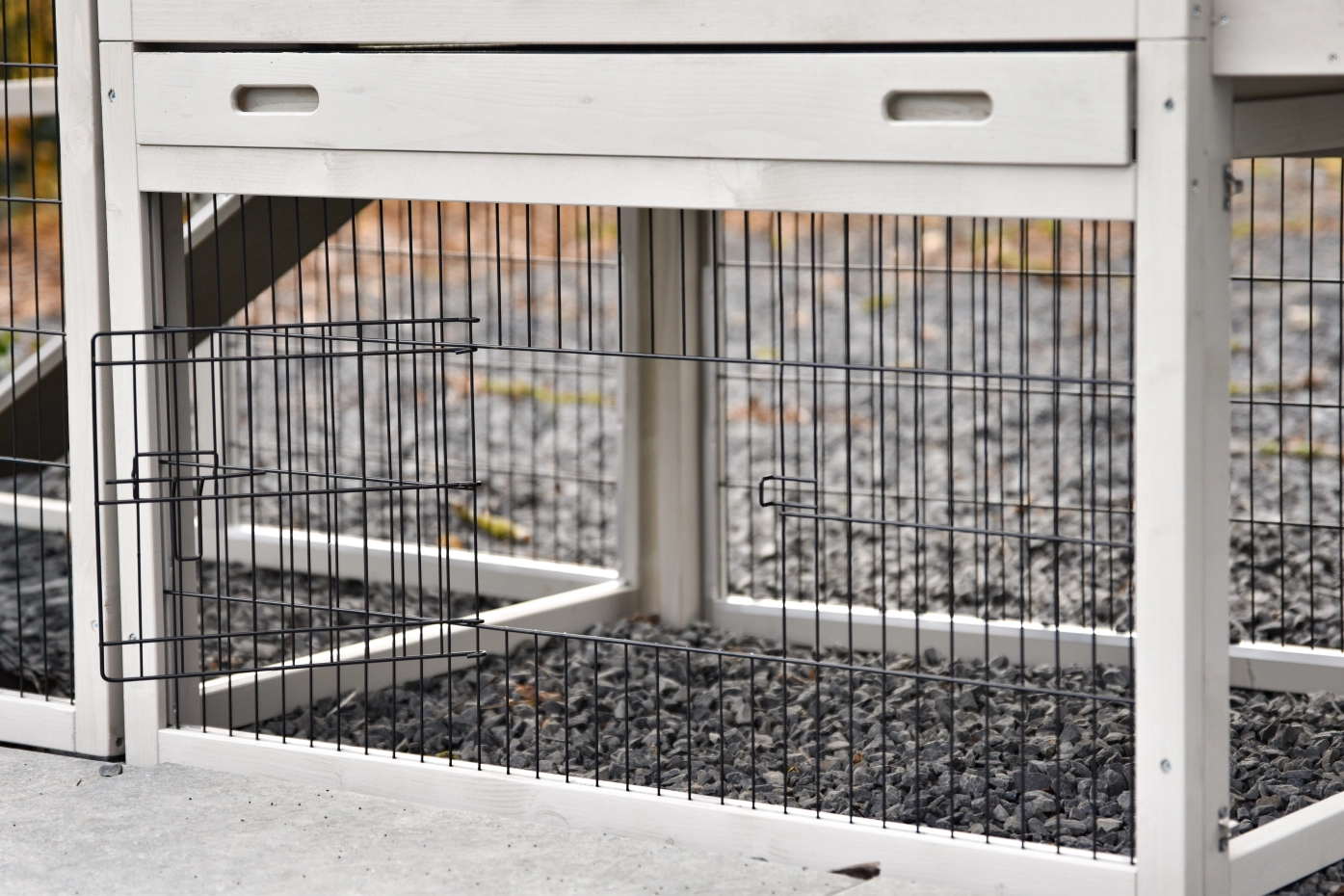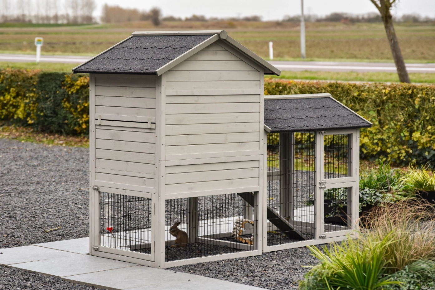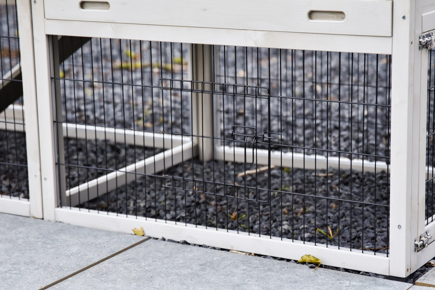 - Het hok heeft anti-knaagstrips op de meest gevoelige plekken, maar is niet volledig beschermd. Voor onbeschermde randen kunt u extra anti-knaagstrips mee bestellen.