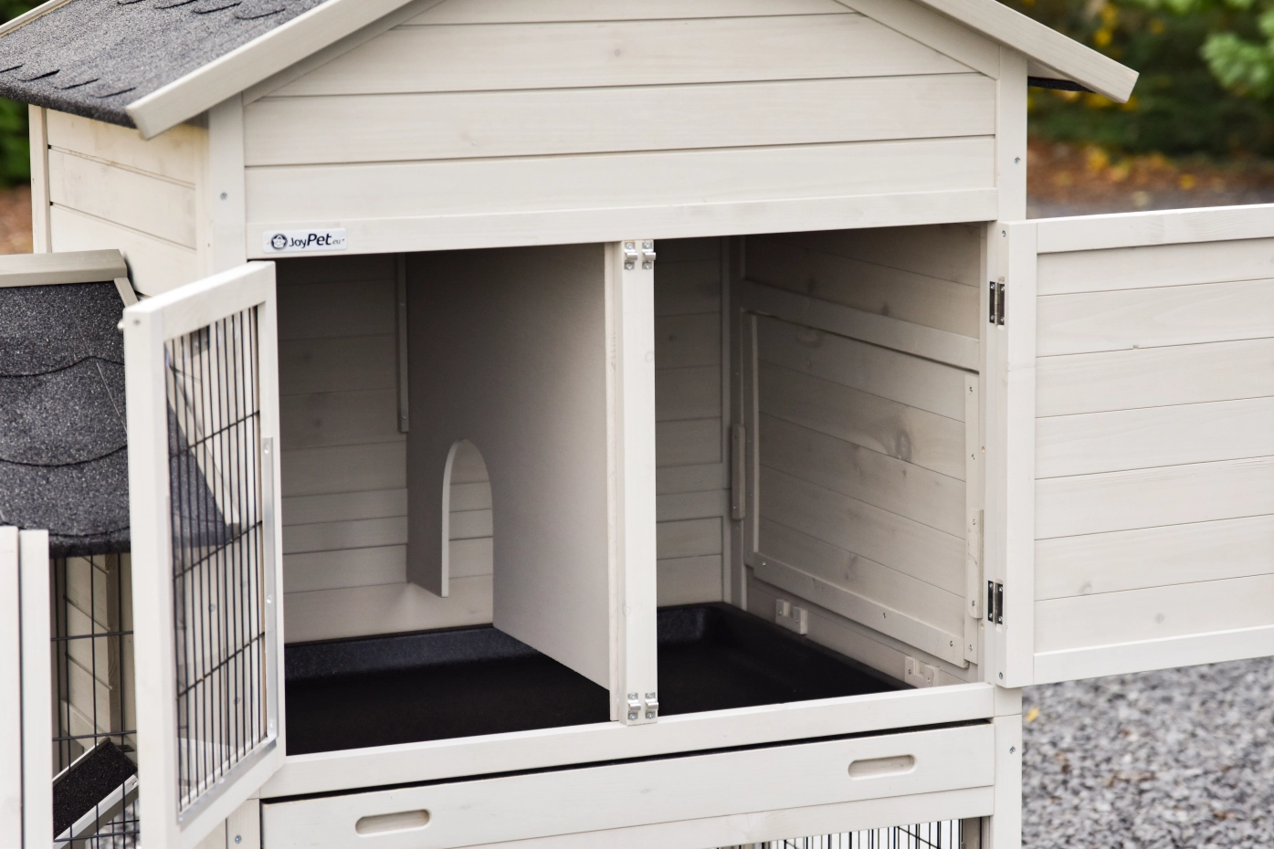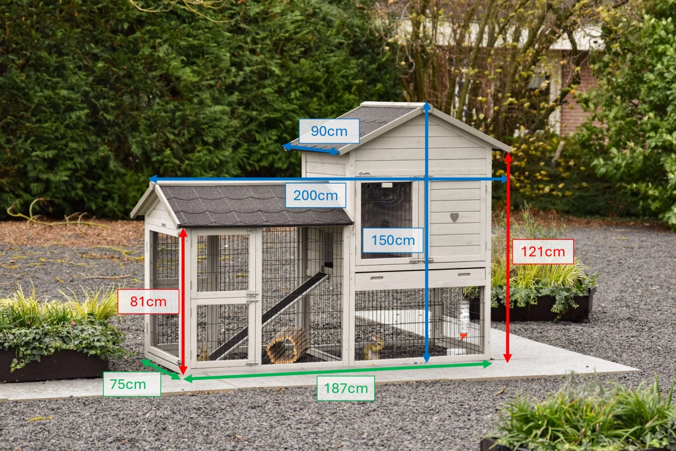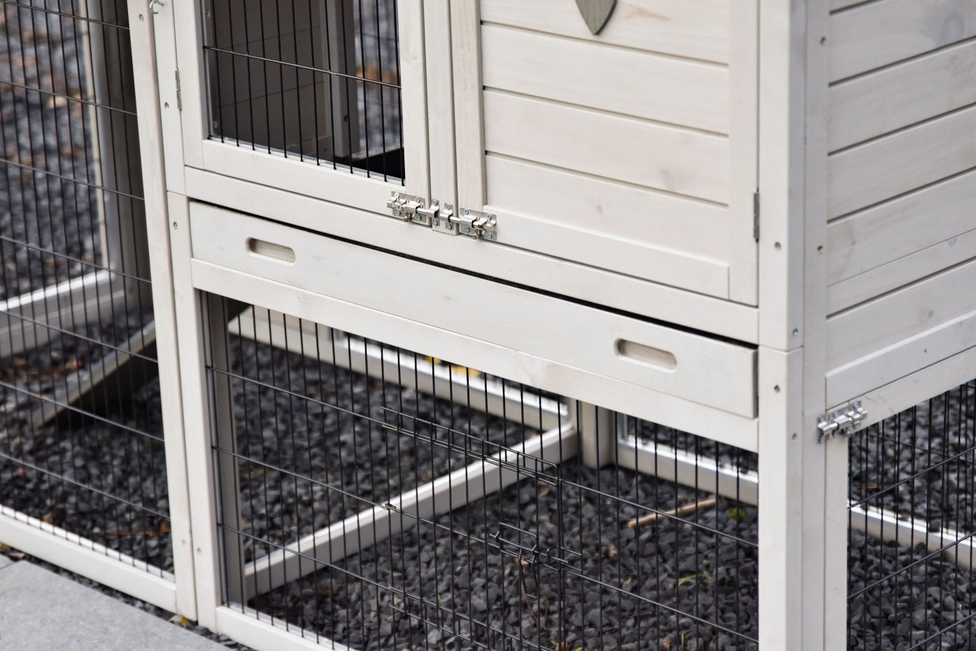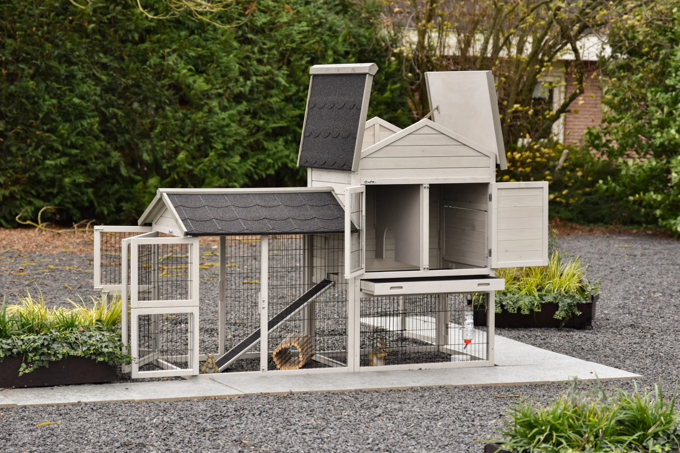 - Het hok heeft anti-knaagstrips op de meest gevoelige plekken, maar is niet volledig beschermd. Voor onbeschermde randen kunt u extra anti-knaagstrips mee bestellen.