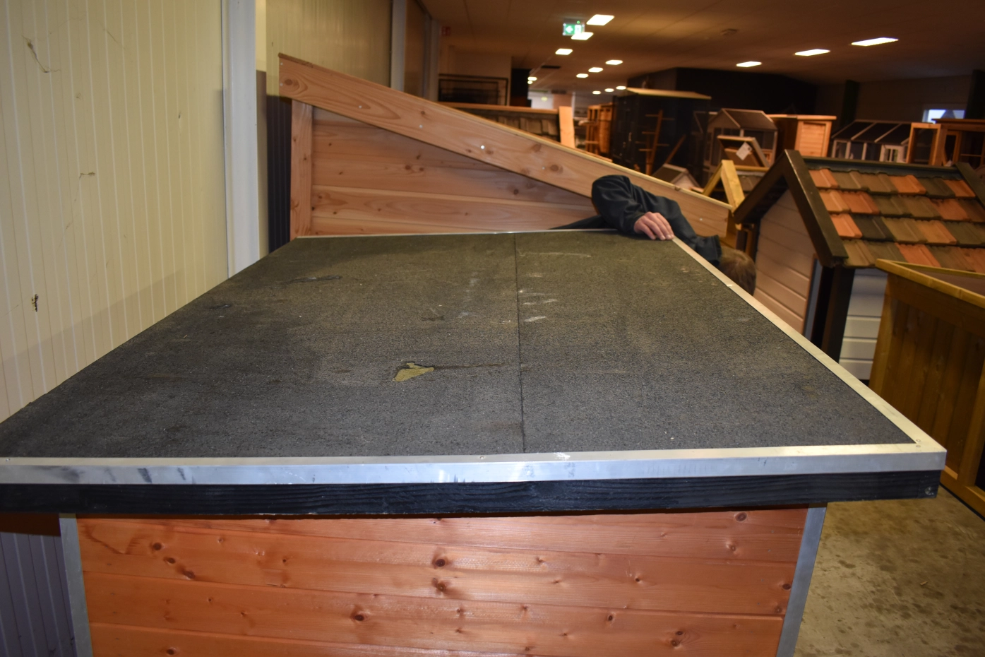 Hondenhok Base Extra Large is een stevig hondenhok met aluminium randen langs de opening en het dakpaneel. In dit dennenhouten hok zit een tochtschot als windscherm, wat ook weggelaten kan worden. Hondenhok Base Extra Large is geschikt voor grote honden. Hondenhok Base Extra Large heeft een ruime opening. De afmetingen van hondenhok Base Extra Large zijn : 179x126x119cm. Dit zijn de maximale buitenwerkse afmetingen incl. dakpaneel. Dit showmodel heeft wat beschadigingen aan het dakleer. Ook het aluminium is beschadigd.